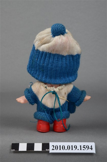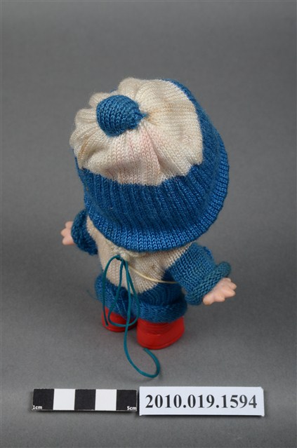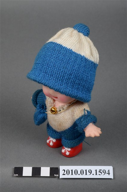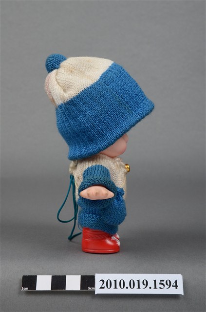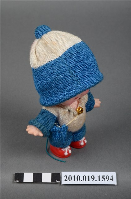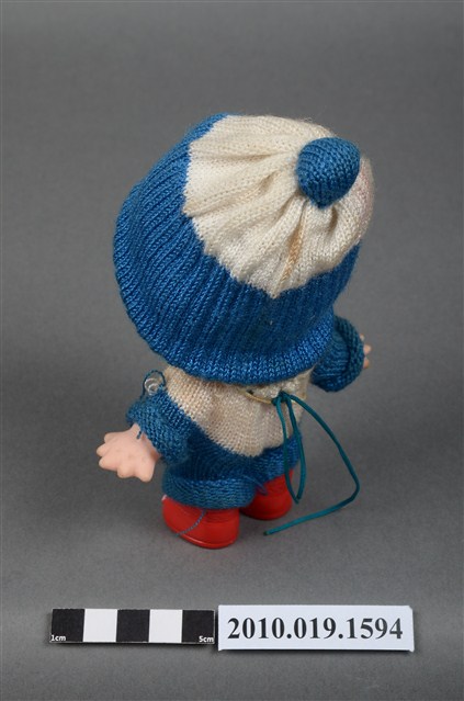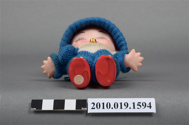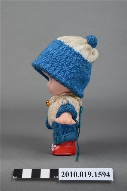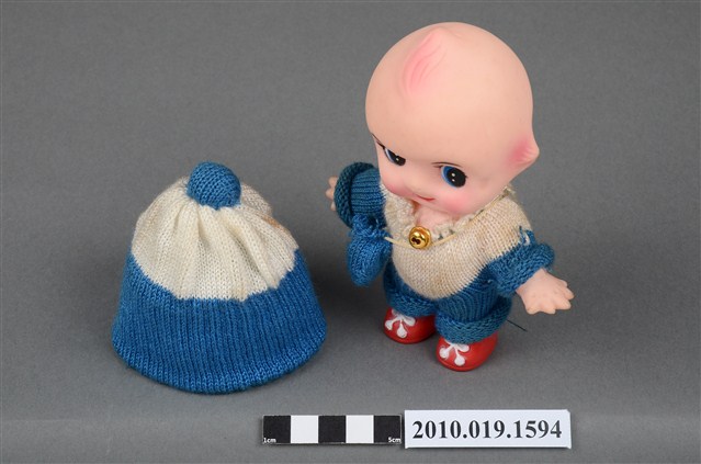 1.本物件為藍色丘比玩偶,塑膠材質一體成型,玩偶頭戴藍色毛帽,帽子頂端有白色圖案裝飾,細眉大眼有明顯睫毛,紅唇微笑,兩頰有腮紅,身著紅藍相間連身褲子,褲子向上捲起,胸前戴一顆金色鈴鐺,並斜揹一個藍色袋子,腳著紅鞋,鞋上有白色蝴蝶結綁帶,雙手平舉以站姿呈現,整個物件保存良好,十分乾淨。