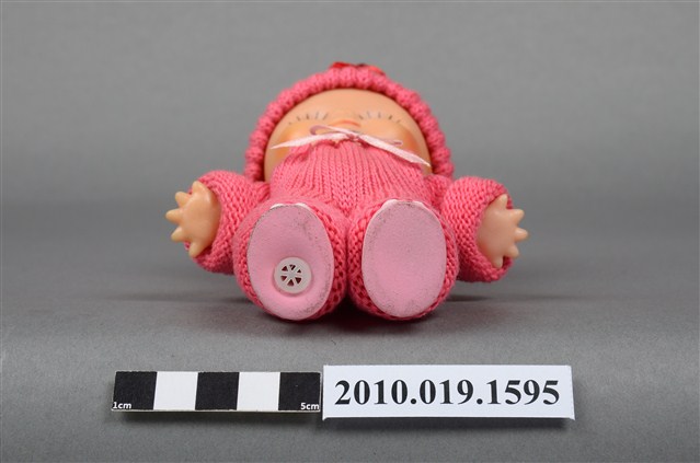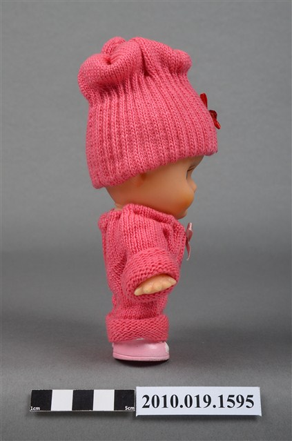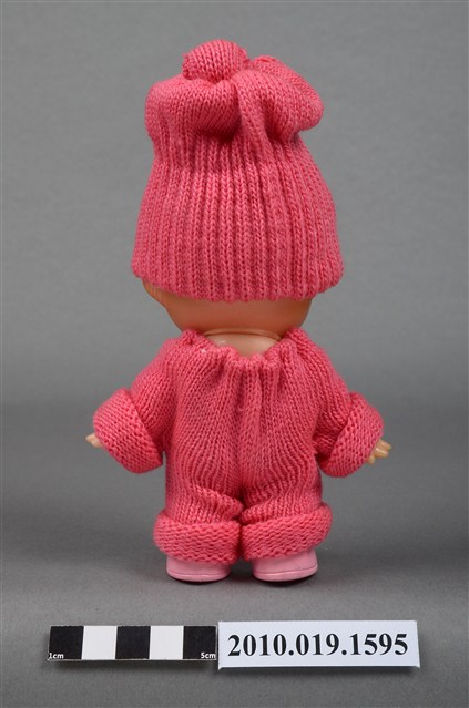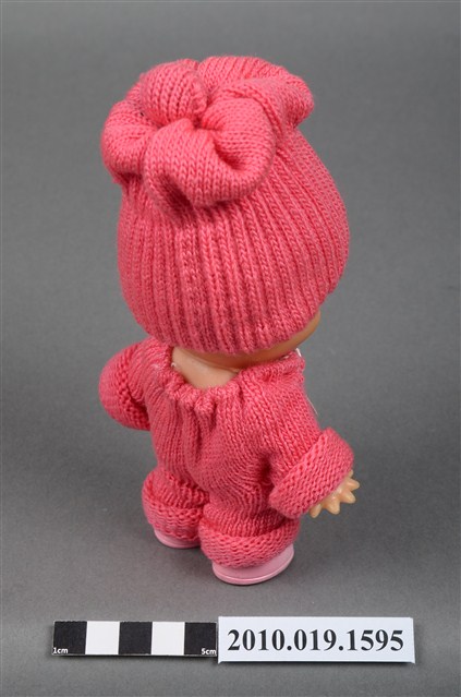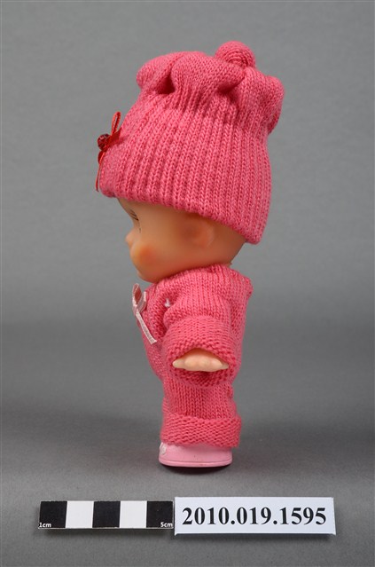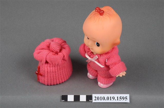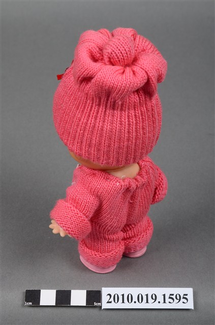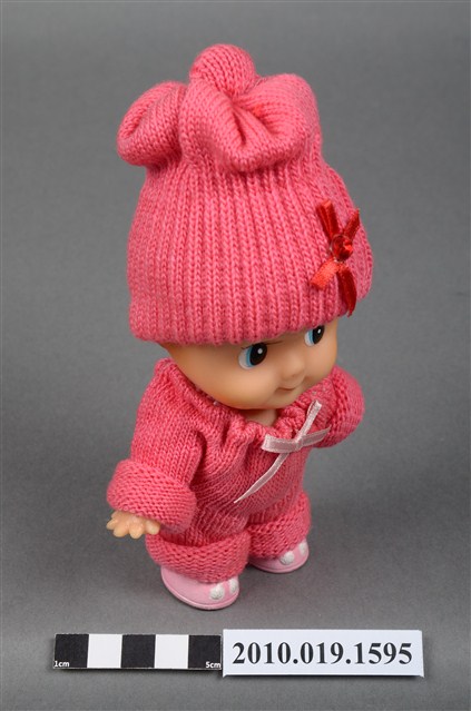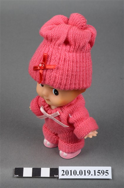 1.本物件為桃紅色丘比玩偶,塑膠材質一體成型,玩偶頭戴桃紅色毛帽,帽子正前方有紅色蝴蝶結裝飾,大眼有明顯睫毛,紅唇微笑,兩頰有腮紅,身著桃紅色連身褲子,褲子向上捲起,雙手袖子亦捲起,胸前繫有一個淺粉色蝴蝶,腳著粉紅鞋,鞋上有白色蝴蝶結綁帶,雙手平舉以站姿呈現,整個物件保存良好,十分乾淨。