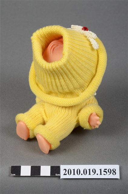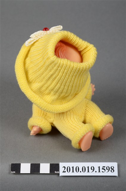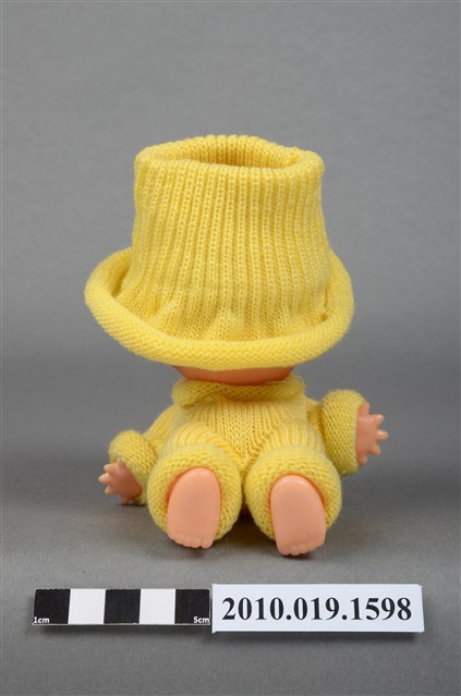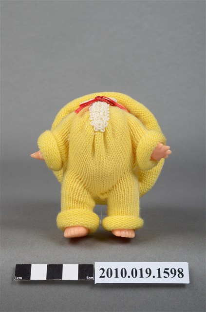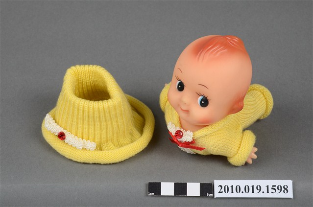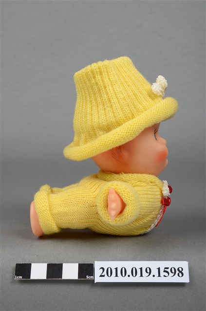 1.本物件為黃色丘比玩偶,塑膠材質一體成型,玩偶頭戴黃色毛帽,帽子前方有白色蝴蝶結與紅色寶石,大眼有明顯睫毛,紅唇微笑,兩頰有腮紅,身著黃色連身褲子,胸前有白色帶子滾邊上面並繫有一個紅寶石與蝴蝶結,並且繫有一個紅色蝴蝶結,褲子向上捲起,雙手袖子亦捲起,腳上未著鞋,雙手平舉以趴著方式呈現,整個物件保存良好,十分乾淨。