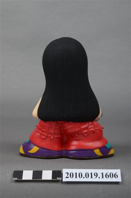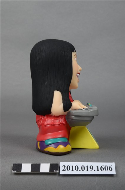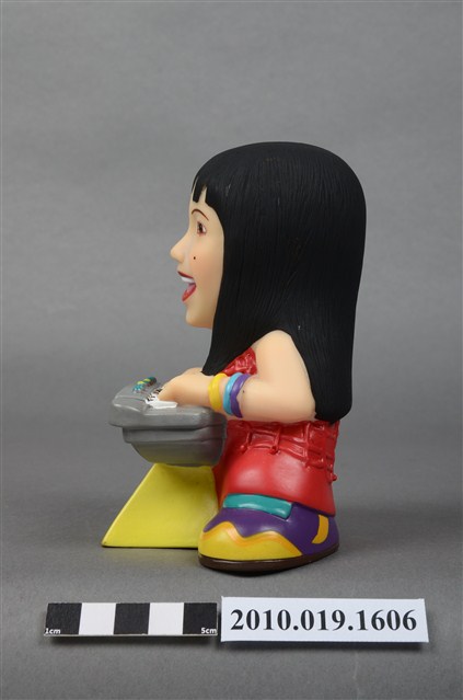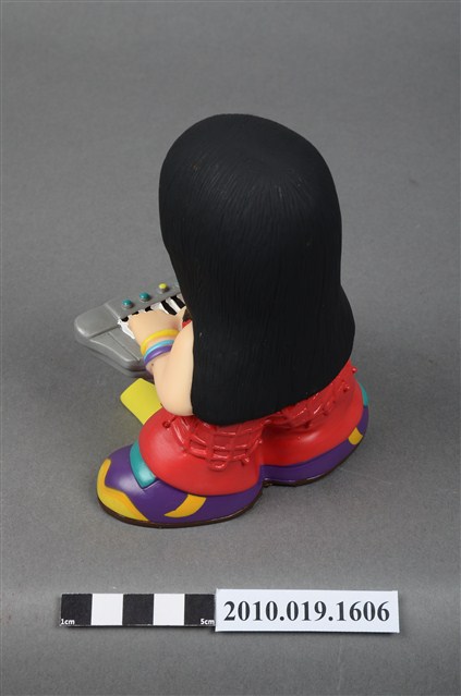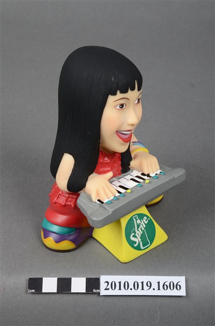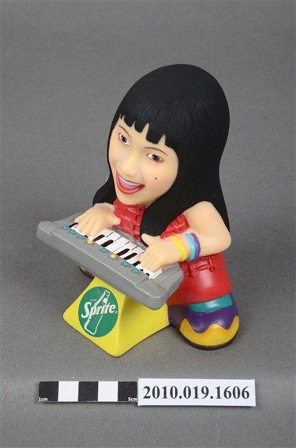 1.本物件為雪碧阿妹玩偶,為塑膠材質,玩偶長髮並有瀏海,細眉大眼,紅唇露齒微笑,兩頰有腮紅,右臉有一顆痔,眼睛看向左方,身穿紅色無袖衣服,紫色鞋子,以站姿方式呈現,前方有一架電子琴,琴腳上畫有「Sprite及商標」,整個物件保良好,十分乾淨。