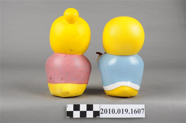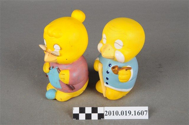 1.本物件為馬來西亞雀巢麥片鳥玩具組,塑膠製品一體成型,右邊為祖父鳥玩偶,身穿藍色上衣並有4顆深藍色鈕扣,眼睛閉上,尖喙旁邊有2撮白色鬍鬚,左手持咖啡色菸斗,右手拿1根黃色拐杖,左邊為祖母鳥玩偶,戴有1副咖啡框眼鏡,身著紅色衣服,雙手拿著毛線棒正在織藍色毛衣,下方還留有藍色毛球。