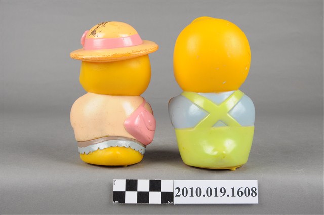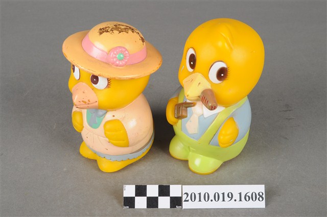 1.本物件為馬來西亞雀巢麥片鳥玩具組,塑膠製品一體成型,右邊為父親鳥玩偶,身穿藍色上衣並有繫白領帶,下半身為綠色吊帶褲,大眼睛,嘴裡抽雪茄,右手持一支咖啡色無線電,左邊為母親鳥玩偶,頭戴黃色滾粉紅邊大圓帽,身著綠色衣服,粉紅色外套及藍色裙子,右手並揹有一個粉紅色包包。