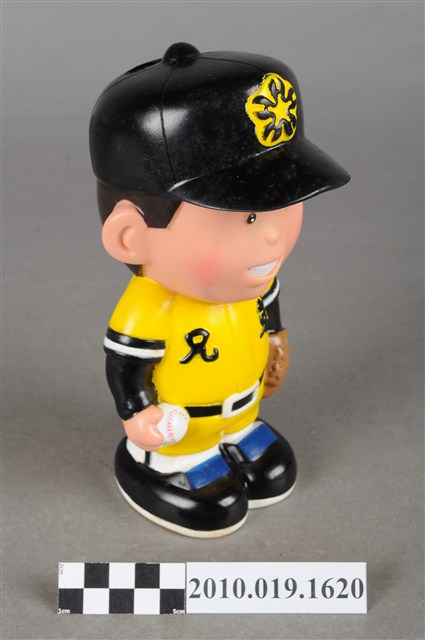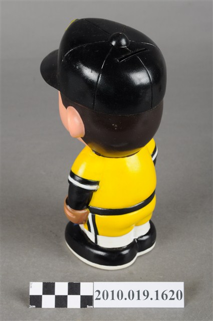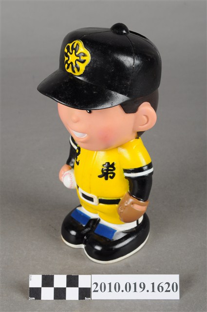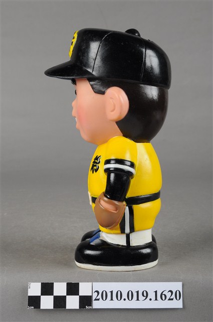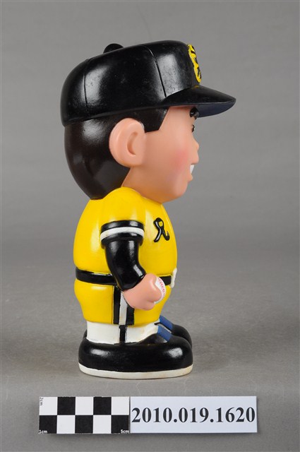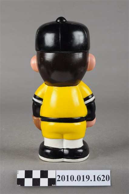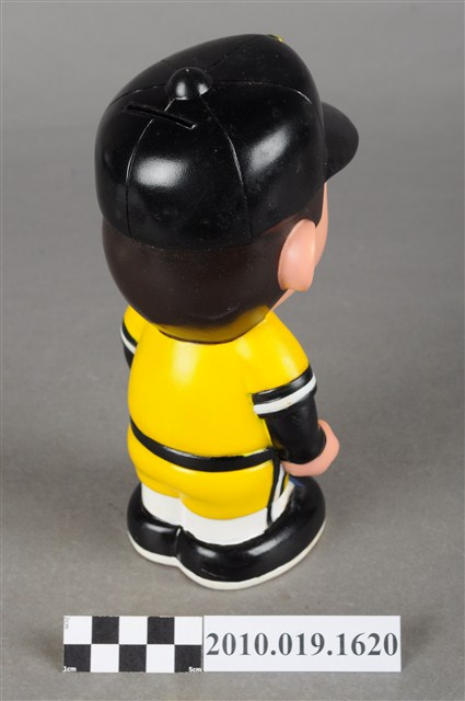 1.本物件為兄弟象球員造型存錢筒。身穿全套兄弟象球衣,包括:兄弟大飯店標誌黑色球帽、黃色滾黑邊球衣球褲、黑色內襯、白色球襪、黑色球鞋。球衣正面有「兄弟」字樣。