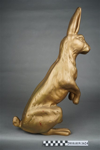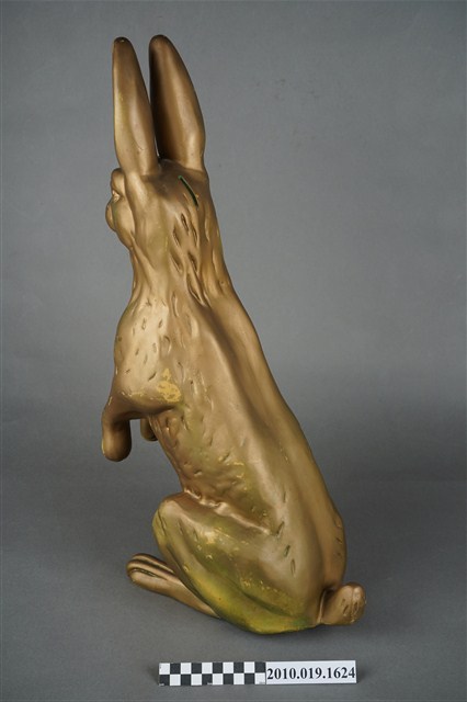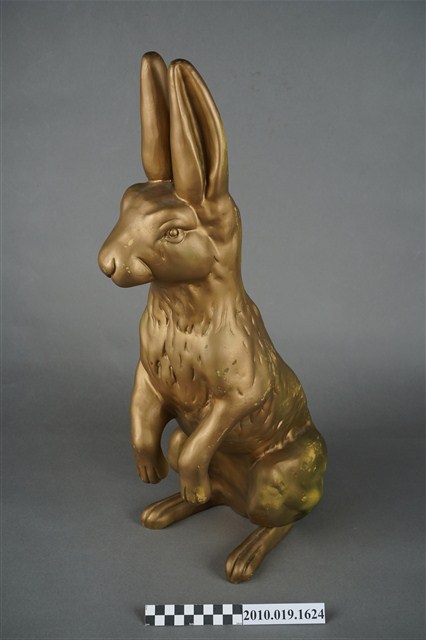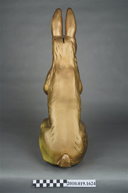 本物件為兔存錢筒,材質為帶有金屬銅色的塑膠。以雙手放在胸前而後腳站立的姿勢,豎著一對大大的耳朵,睜圓的眼睛彷彿正看著某個地方,背後臀部位置有個短短的尾巴,完整呈現兔子的樣貌。頭部後方有一長方形孔洞可投零錢,底部中心有一黑色圓形塞子,應為取出零錢處,其周邊似有沾染綠色顏料等髒污。