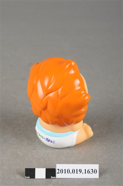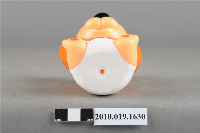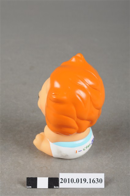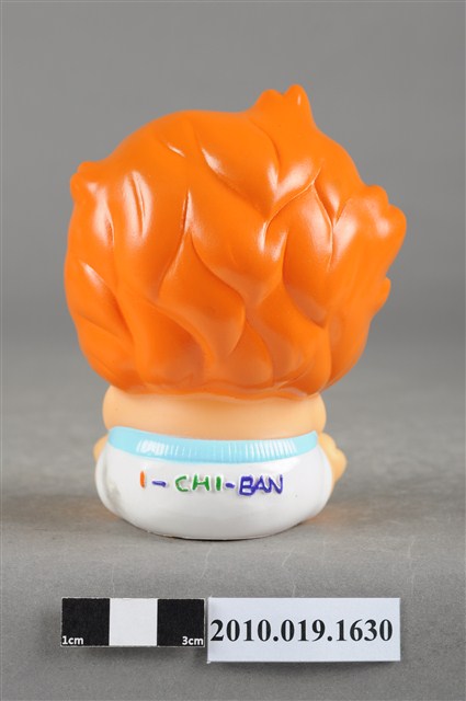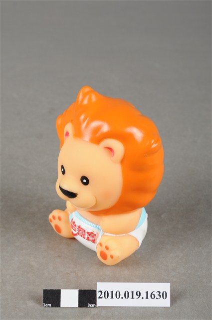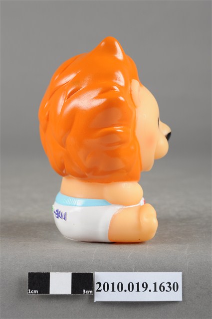 1.本物件為橘色怡親寶獅玩偶,為塑膠材質一體成型,為獅子造型的玩偶,獅子鬃毛為橘色,並露出兩個耳朵,內耳為紅色,大眼睛黑鼻子,並張嘴微笑,下半身著白色滾藍邊的尿布,尿布正面寫有紅色「怡親寶」字樣,背面則為「I-CHI-BAN」字樣,玩偶未著鞋,露出粉色腳掌,底盤並寫有「1998」字樣,整個物件保存良好。