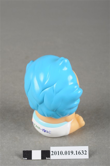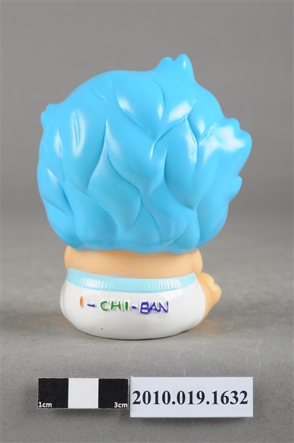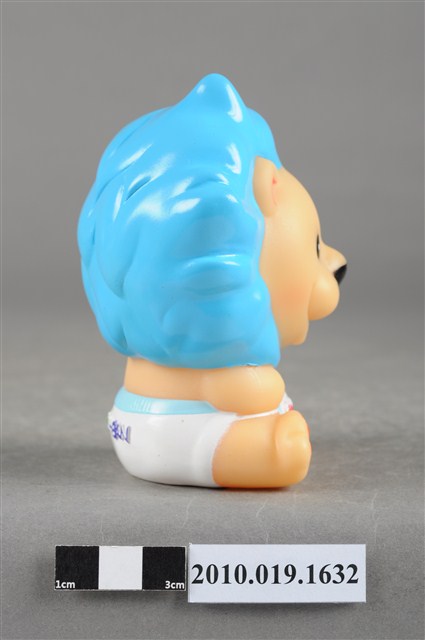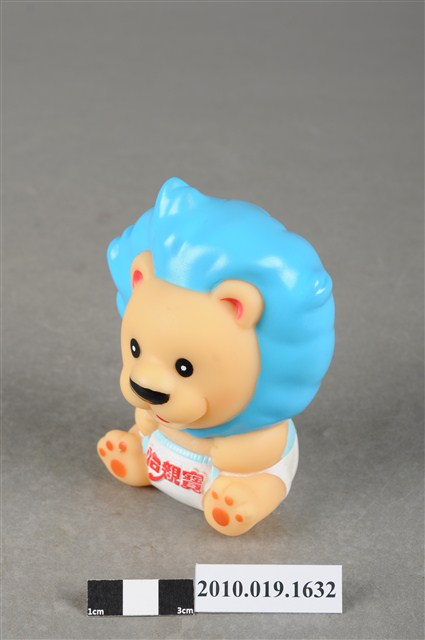 1.本物件為淺藍色怡親寶獅玩偶,為塑膠材質一體成型,為獅子造型的玩偶,獅子鬃毛為淺藍色,並露出兩個耳朵,內耳為紅色,大眼睛黑鼻子,並張嘴微笑,下半身著白色滾藍邊的尿布,尿布正面寫有紅色「怡親寶」字樣,背面則為「I-CHI-BAN」字樣,玩偶未著鞋,露出粉色腳掌,底盤並寫有「1998」字樣,整個物件保存良好。