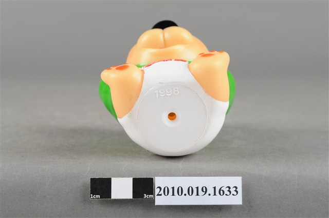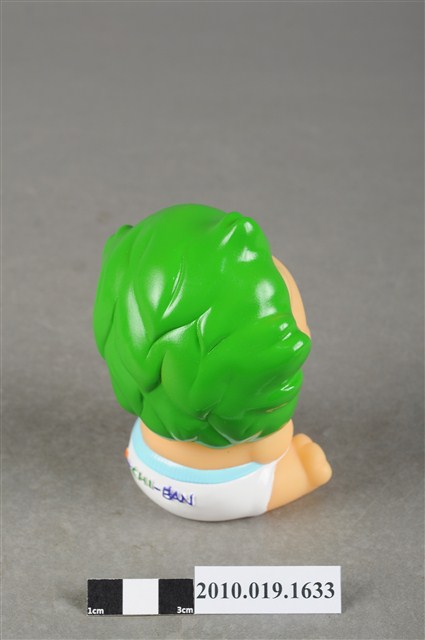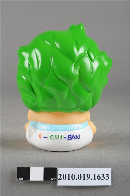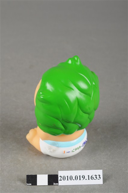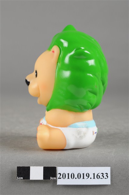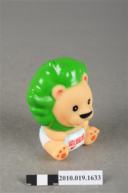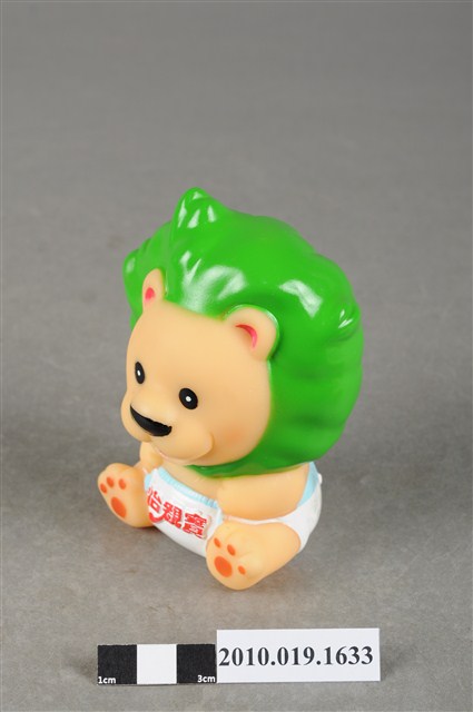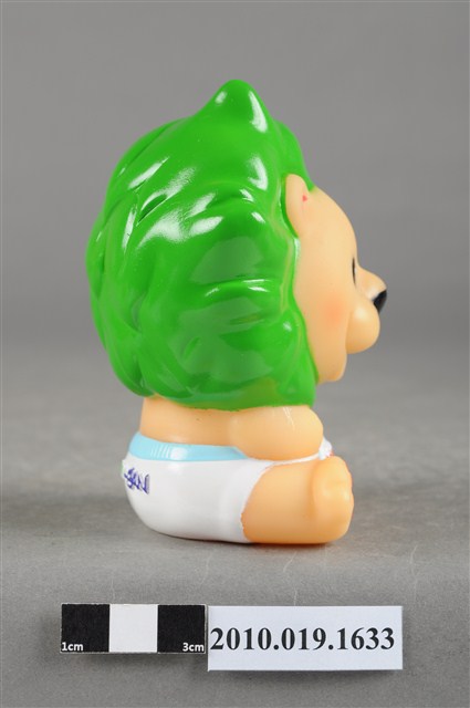 1.本物件為綠色怡親寶獅玩偶,為塑膠材質一體成型,為獅子造型的玩偶,獅子鬃毛為綠色,並露出兩個耳朵,內耳為紅色,大眼睛黑鼻子,並張嘴微笑,下半身著白色滾藍邊的尿布,尿布正面寫有紅色「怡親寶」字樣,背面則為「I-CHI-BAN」字樣,玩偶未著鞋,露出粉色腳掌,底盤並寫有「1998」字樣,整個物件保存良好。