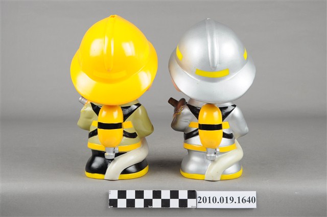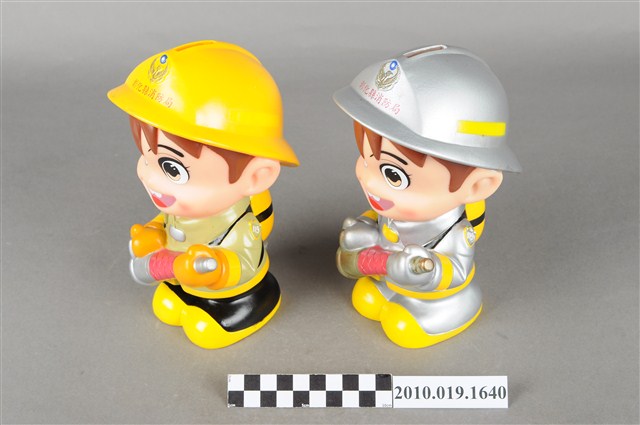 1.本物件為彰化縣消防寶寶造型存錢筒組,身穿全套消防設備,手拿消防瞄的消防寶寶存錢筒。左邊為黃色頭盔、綠色消防衣、黑色靴子,右邊為銀色頭盔、消防衣、與靴子。兩個頭盔上都有「彰化縣消防局」字樣與消防標誌,右側衣領上都有「1999」字樣。