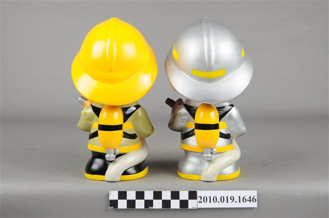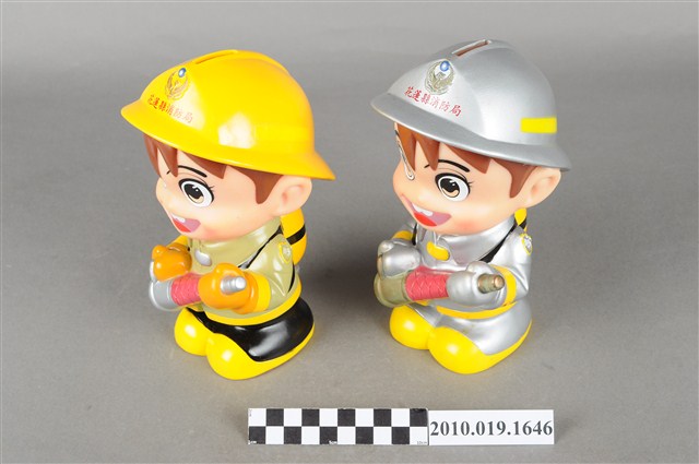 1.本物件為花蓮縣消防寶寶造型存錢筒組,身穿全套消防設備,手拿消防瞄的消防寶寶存錢筒。左邊為黃色頭盔、綠色消防衣、黑色靴子,右邊為銀色頭盔、消防衣、與靴子。兩個頭盔上都有「花蓮縣消防局」字樣與消防標誌,右側衣領上都有「1999」字樣。