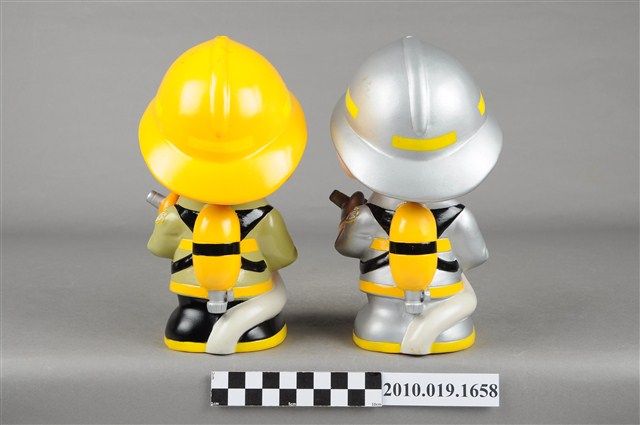 1.本物件為屏東縣消防寶寶造型存錢筒組,身穿全套消防設備,手拿消防瞄的消防寶寶存錢筒。左邊為黃色頭盔、綠色消防衣、黑色靴子,右邊為銀色頭盔、消防衣、與靴子。兩個頭盔上都有「屏東縣消防局」字樣與消防標誌,右側衣領上都有「1999」字樣。