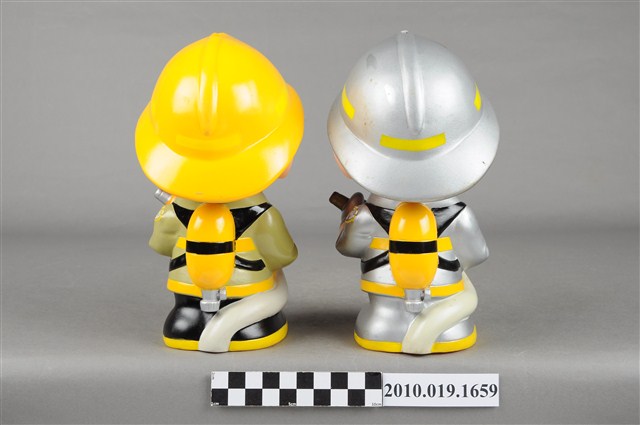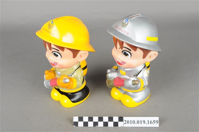 1.本物件為連江縣消防寶寶造型存錢筒組,身穿全套消防設備,手拿消防瞄的消防寶寶存錢筒。左邊為黃色頭盔、綠色消防衣、黑色靴子,右邊為銀色頭盔、消防衣、與靴子。兩個頭盔上都有「連江縣消防局」字樣與消防標誌,右側衣領上有「1999」字樣。
