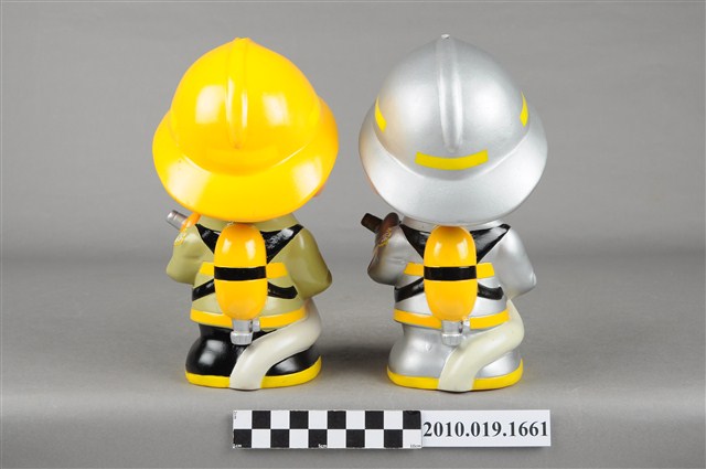 1.本物件為臺中縣消防寶寶造型存錢筒組,身穿全套消防設備,手拿消防瞄的消防寶寶存錢筒。左邊為黃色頭盔、綠色消防衣、黑色靴子,右邊為銀色頭盔、消防衣、與靴子。兩個頭盔上都有「台中縣消防局」字樣與消防標誌,右側衣領上都有「1999」字樣。