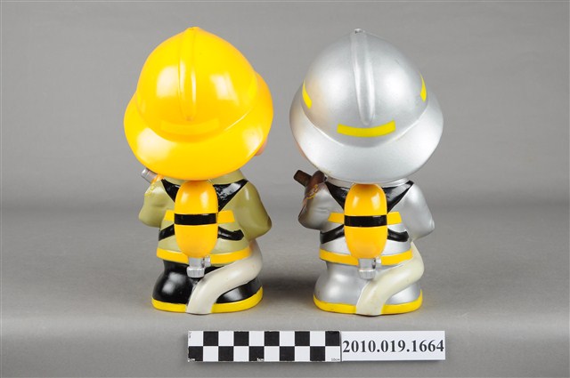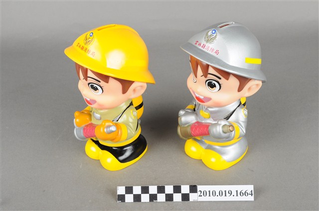 1.本物件為雲林縣消防寶寶造型存錢筒組,身穿全套消防設備,手拿消防瞄的消防寶寶存錢筒。左邊為黃色頭盔、綠色消防衣、黑色靴子,右邊為銀色頭盔、消防衣、與靴子。兩個頭盔上都有「雲林縣消防局」字樣與消防標誌,右側衣領上都有「1999」字樣。
