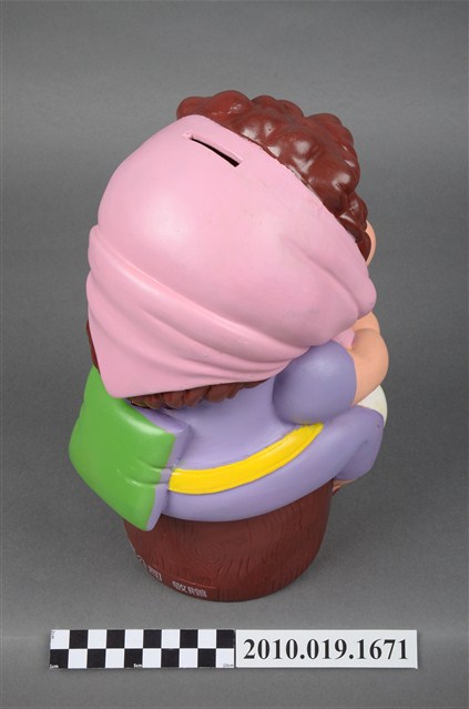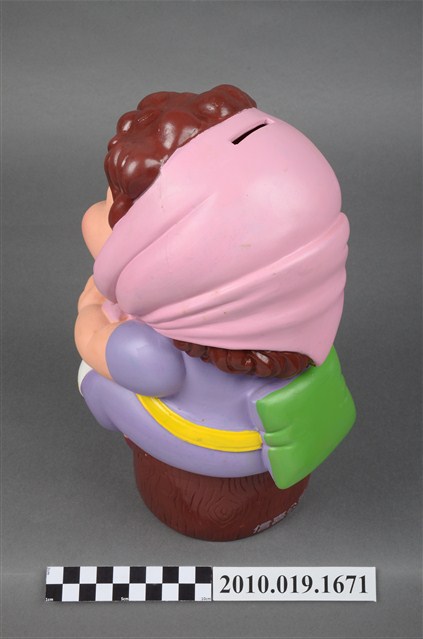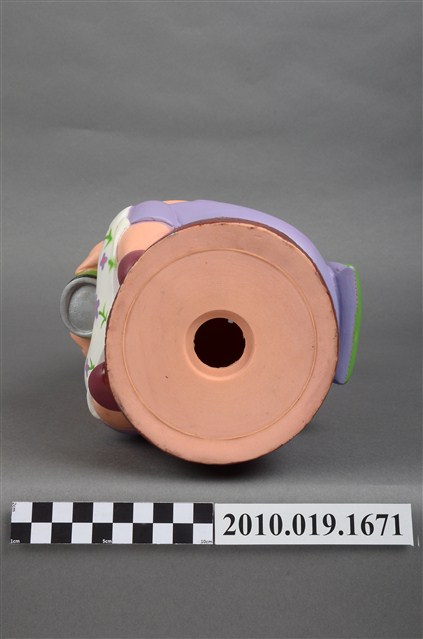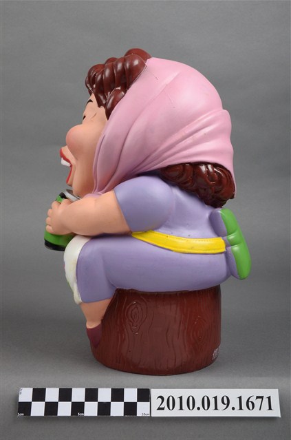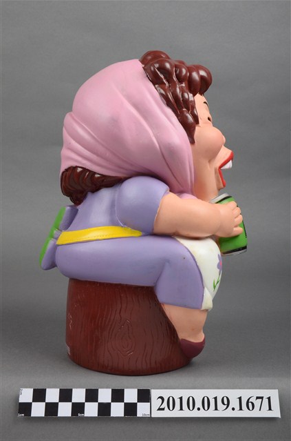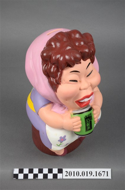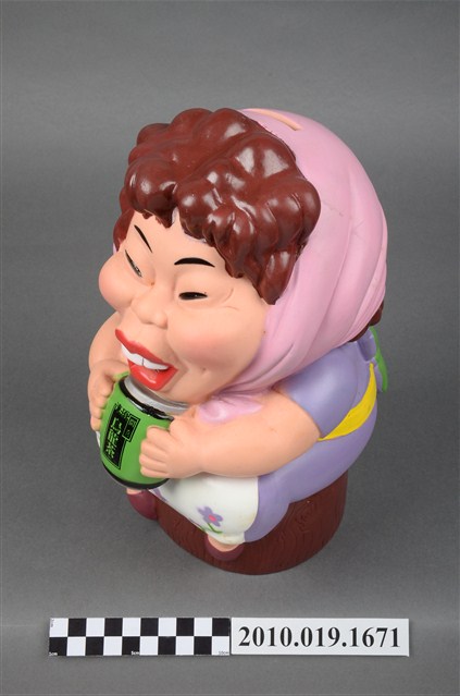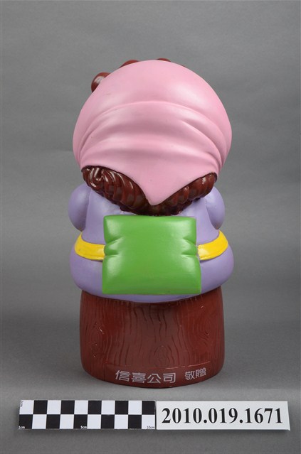 1.本物件為開喜婆婆玩偶存錢筒,材質為塑膠。呈現手拿印有「開喜」、「凍頂」、「烏龍茶」字樣的綠色包裝飲料罐坐在樹樁上坐姿,開喜婆婆一頭濃密深棕色捲髮戴著粉紅色頭巾,臉部雙眼瞇著,一口暴牙的嘴巴以「啊」的嘴型張開,似相當滿足的模樣。身穿粉紫色連身裙,腰間前方圍著紫色小花圍裙,背後綁著綠色包包,坐著的樹樁印有「信喜公司 敬贈」字樣。頭頂正上方有一長方形孔洞可投零錢,底部中心有一圓形孔洞,應為取出零錢處。
