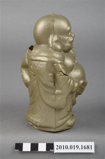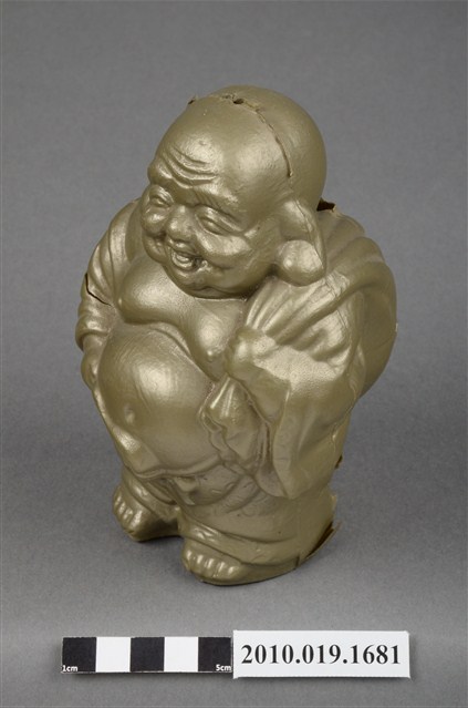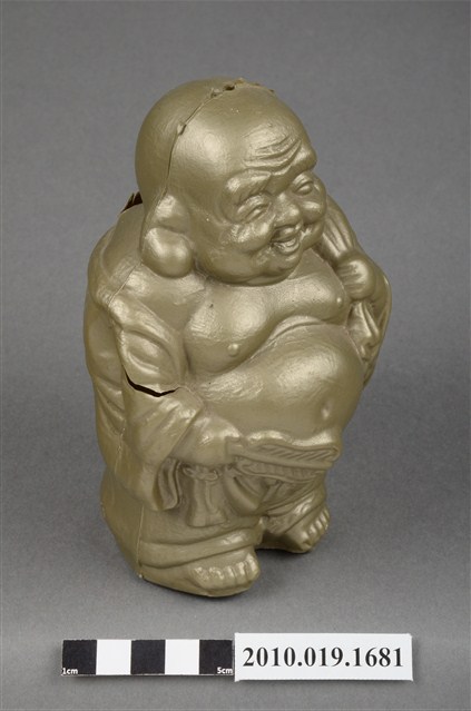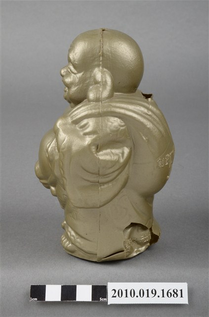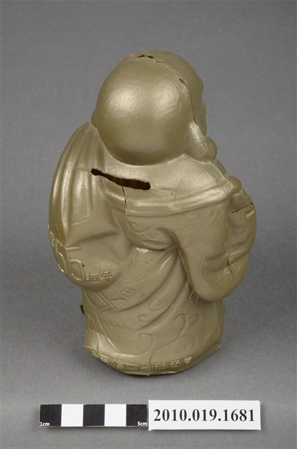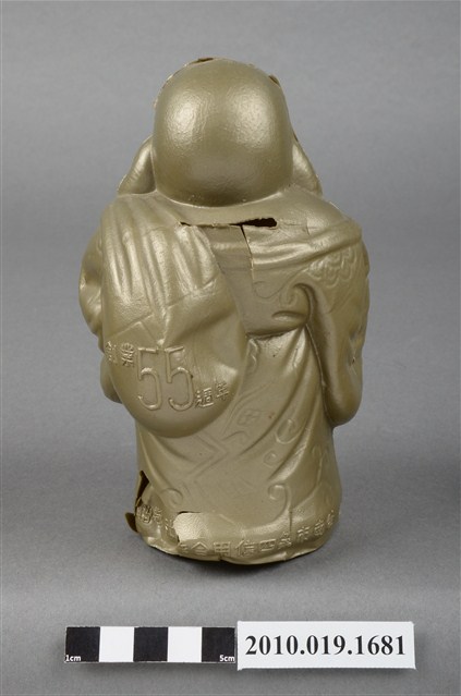 1.本物件為臺南市第四信用合作社彌勒佛存錢筒,材質為塑膠。呈現身穿袈裟一手持扇子另一手揹布袋站姿,背部後方肩頸位置有一長方形孔洞可投零錢,布袋印有「創業55週年」字樣,袈裟尾部印有「臺南市第四信用合作社敬贈」字樣。整尊彌勒佛各處有破損痕跡:長方形孔洞被劃出切口、布袋被撞凹、左右兩側肩膀皆被撞凹其中一處破裂、尾部印有「敬贈」字樣的地方破裂。