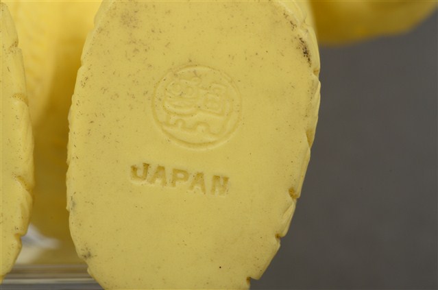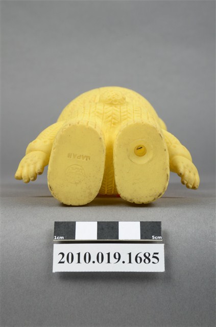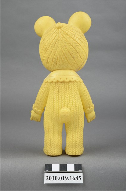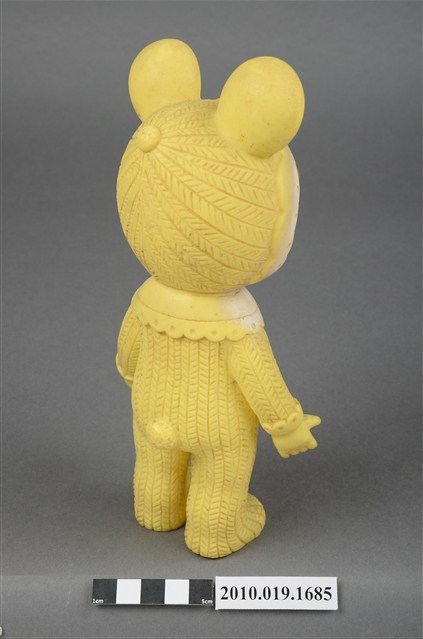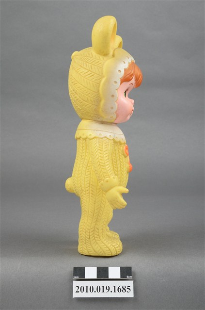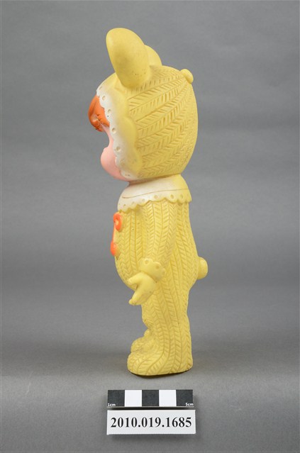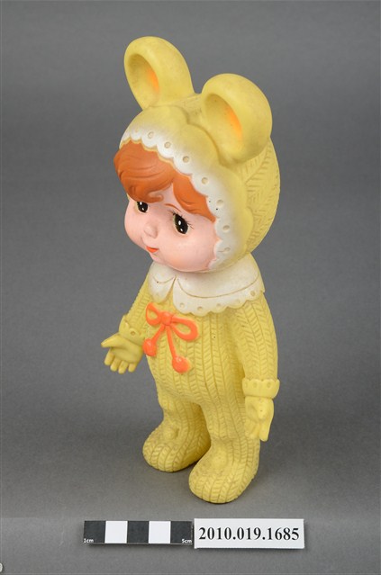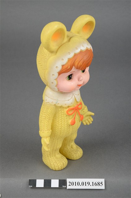 本物件為黃衣小孩玩偶,為塑膠材質一體成型,小孩頭戴黃色帽子,帽子上有兩個圓形大耳朵為造型,帽緣有白色滾邊,露出咖啡色瀏海,細眉大眼,雙頰圓潤,身著黃色連身衣褲,圍有白色圍兜並繫有一條橘色系蝴蝶結,以站姿呈現,整個物件保存尚可,造型簡單。