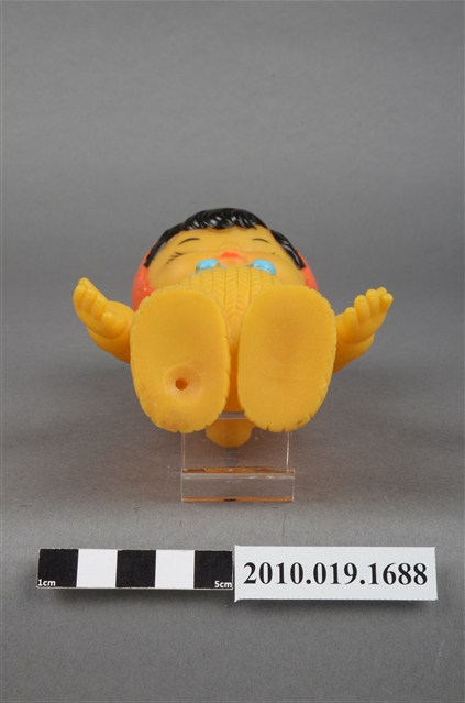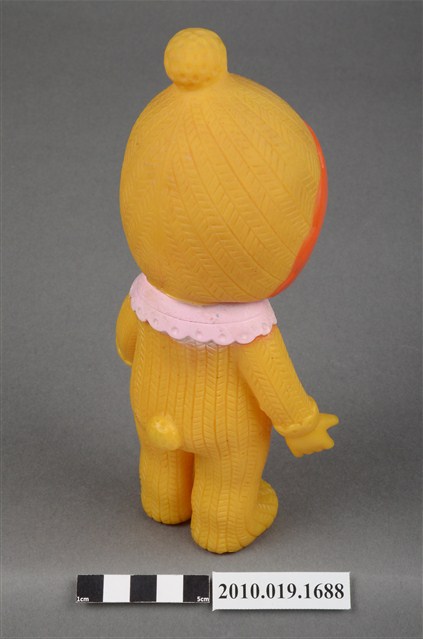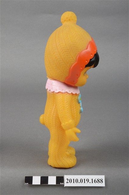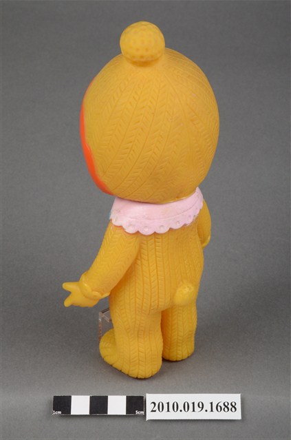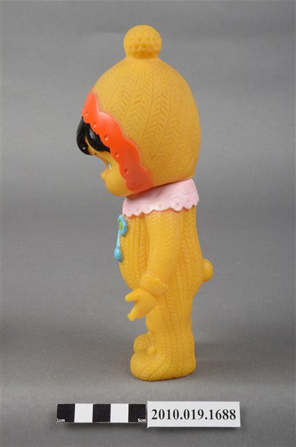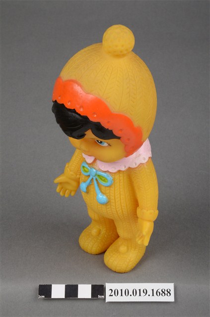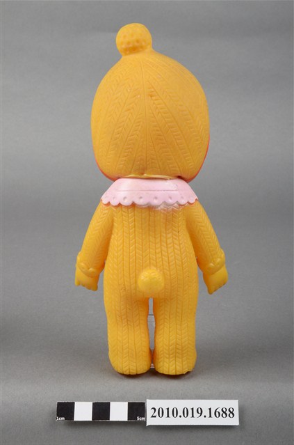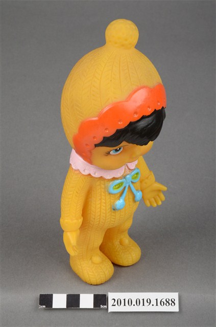 本物件為黃衣小孩玩偶,為塑膠材質一體成型,小孩頭戴黃色帽子,帽子頂端有一個圓形毛球為造型,帽緣並有橘色滾邊,露出黑色瀏海,細眉大眼,雙頰圓潤,身著黃色連身衣褲,並圍有粉色圍兜並繫有一條藍色系蝴蝶結,以站姿呈現,整個物件保存尚可,造型簡單。