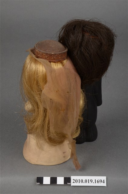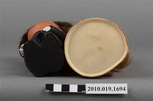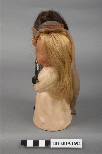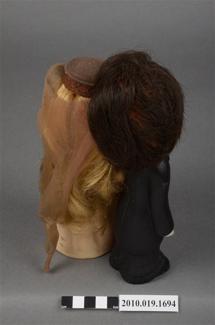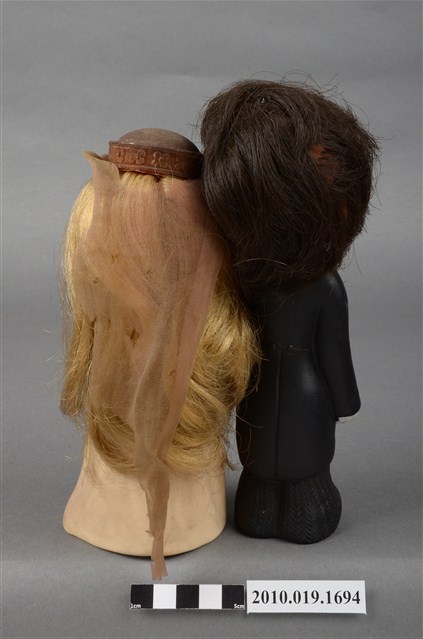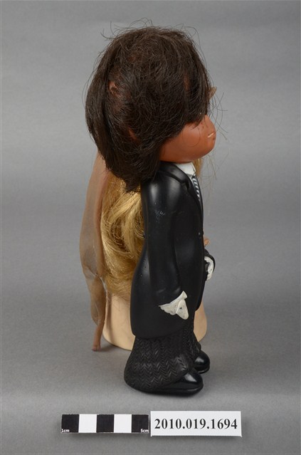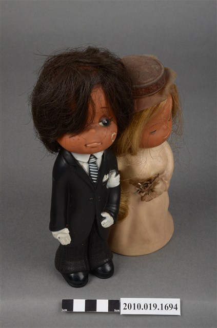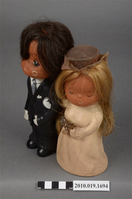 本物件為新郎新娘造型玩偶,右邊為著整套黑色西裝的新郎,中長髮瀏海並遮住半眼,裡面著白色襯衫並繫條紋領帶,手戴白色手套,腳著黑鞋,臉上並留有一個白色唇印,應為新娘所留下,左邊為新娘,著白色長洋裝,頭帶咖啡色小帽,長髮過腰,細眉閉眼,左手拿捧花,右手勾住新郎手臂,洋溢幸福感,整個物件保存尚可。