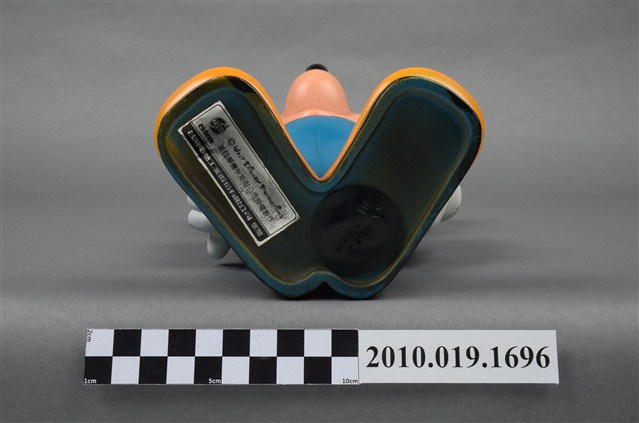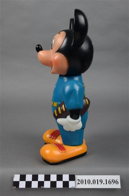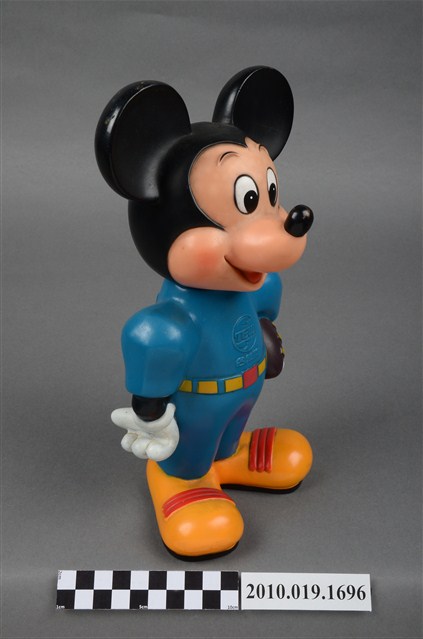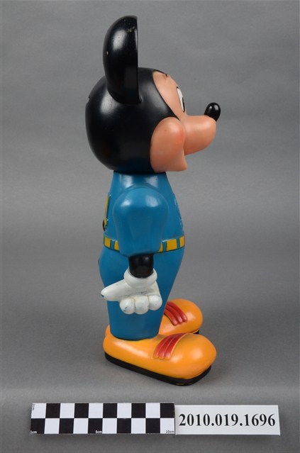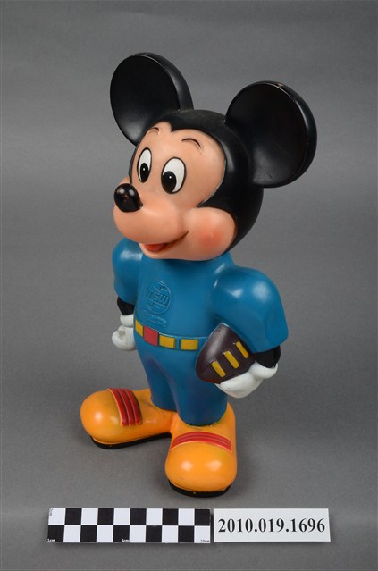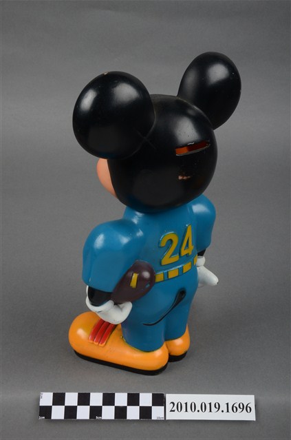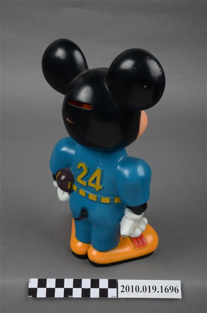 1.本物件為台熱牌米老鼠造型存錢筒。身穿藍色美式足球服裝,腰繫橘、紅色腰帶,腳穿橘色鞋子,右手抱著橄欖球。球衣正面有台熱牌商標,背面有「24」。腳底貼有印著迪士尼以及台熱牌商標,以及「美國華德狄斯耐公司授權製作 台灣電熱工業股份有限公司敬贈」等字樣的貼紙。