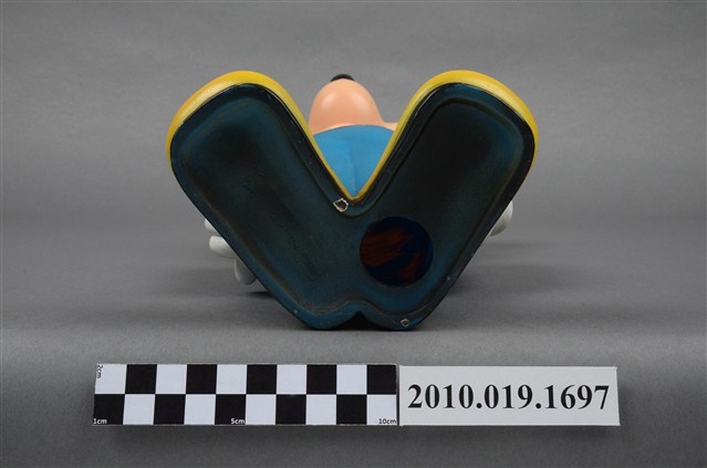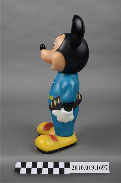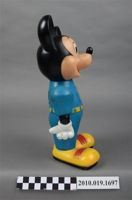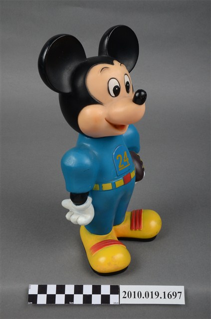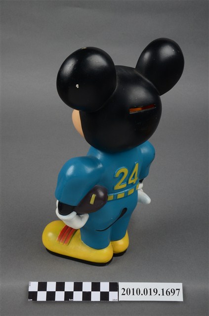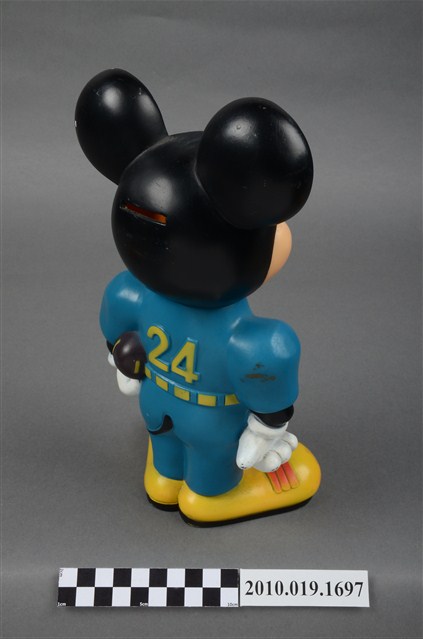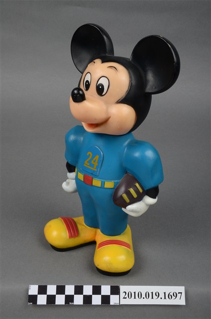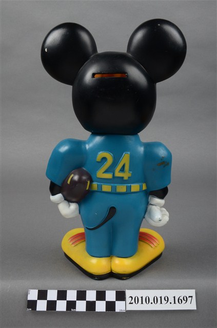 1.本物件為台熱牌米老鼠造型存錢筒。身穿藍色美式足球服裝,腰繫橘、紅色腰帶,腳穿橘色鞋子,右手抱著橄欖球。球衣正面及背面有「24」。腳底印有迪士尼英文商標(模糊)。