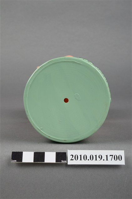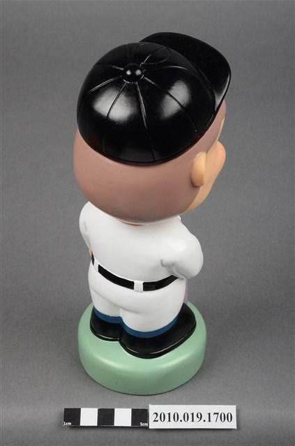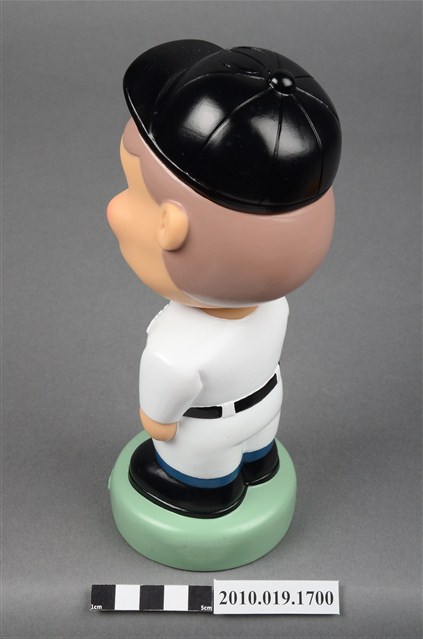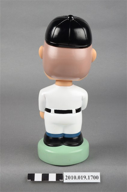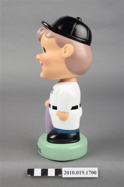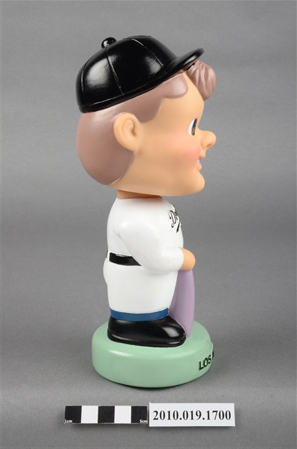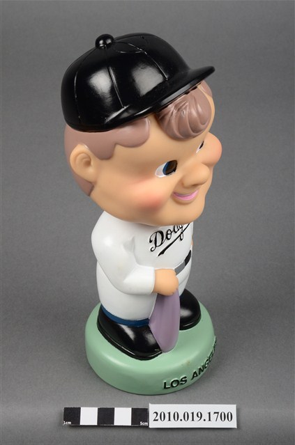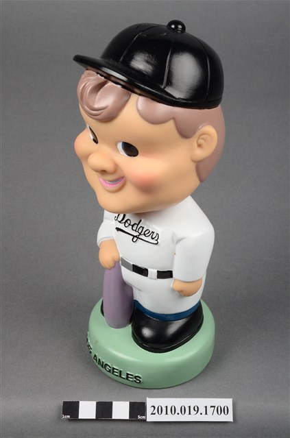 1.本物件為洛杉磯道奇隊球員搖頭公仔,玩偶頭戴黑色棒球帽,露出咖啡色瀏海,大眼張嘴微笑,露出上排白色牙齒,兩頰有粉紅色腮紅,身著白色棒球服裝,上衣正中央並印有黑色「Dodgers」字樣,腰上繫黑色皮帶,腳著黑色鞋子,右手持球棒,底座則為綠色,玩偶頭部與身體由彈簧連接,因此能搖擺晃頭,整個物件保存良好。