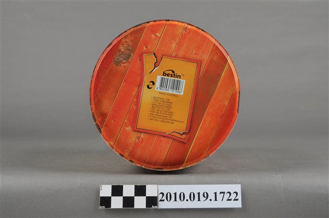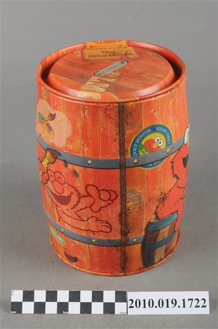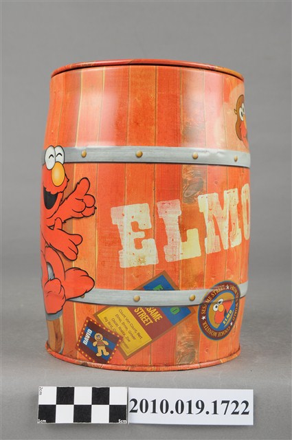 1.本物件為芝麻街木桶造型存錢筒。筒上繪有芝麻街布偶之一:艾蒙(Elmo)的圖像、「ELMO」字樣、以及芝麻街商標。