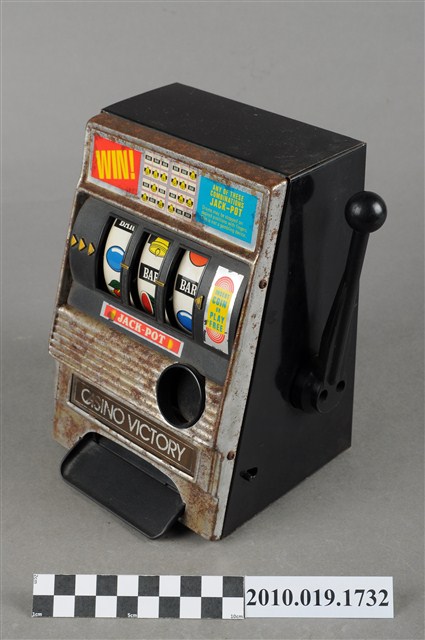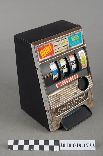 1.本物件為吃角子老虎玩具,以吃角子老虎機為原型,其機身為銀色,最上方為遊戲說明,中間有三根捲軸,捲軸上有不同圖案,旁邊則有一個投幣孔以及一個啟動機器的操縱桿,機器下方寫有「CASINO VICTORY」字樣,中間螢幕上會隨機滾動出現不同圖案,最下面則出幣孔,機器最底座畫有其商標及寫上「WACO」與「MADE IN JAPAN」字樣。