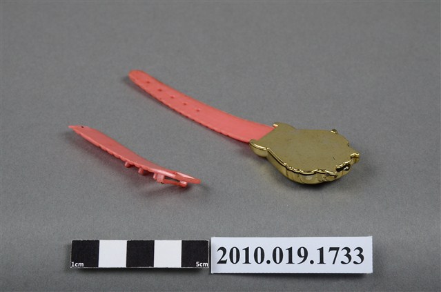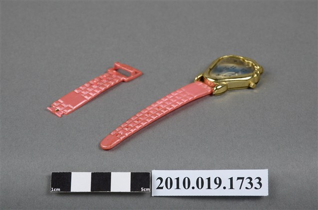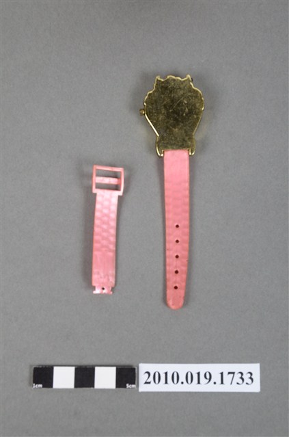 本物件為粉色錶帶玩具手錶,錶面為草莓造型金色框,螢幕底色為藍色,時間停止在8點鐘、28日,錶帶為粉紅色,一邊錶帶上有5個小圓孔,另一邊的錶帶已經斷裂,整個物件沒有太多污漬。