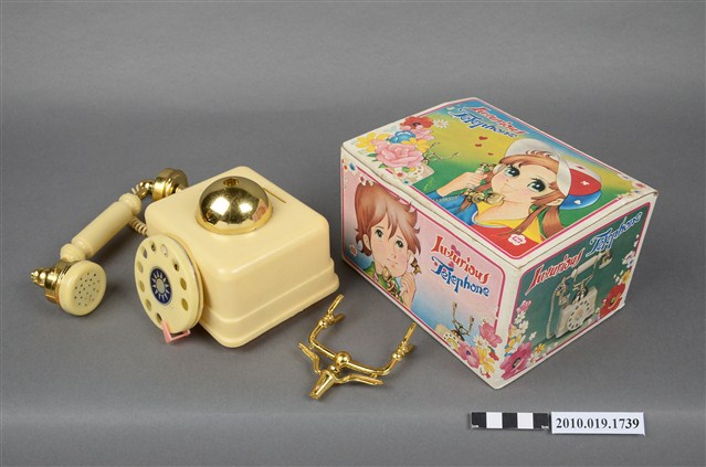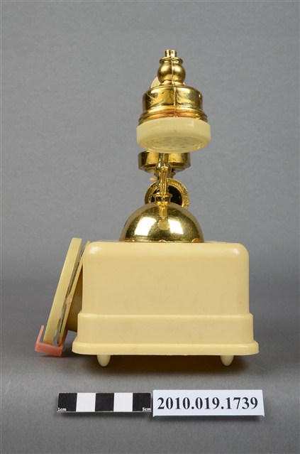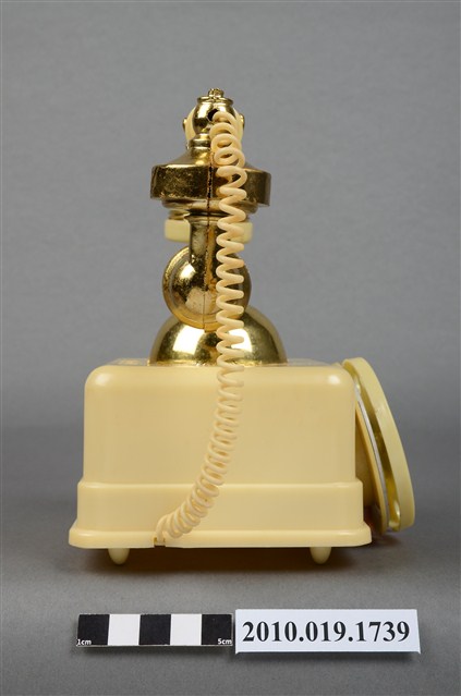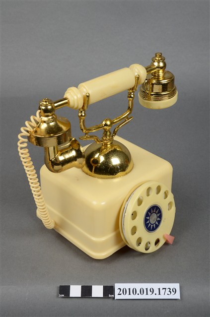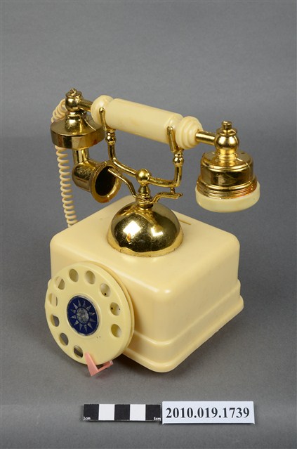 本物件為復古轉盤式電話造型存錢筒,材質為塑膠,整體為米黃鑲金配色造型。話機本體為米黃色,前方有電話轉盤其中心貼有國徽,話機上方裝有金黃色話筒支架,旁有一長方形孔洞可投零錢,話機底部中心有一圓形旋鈕應為取出零錢處,旋鈕上印有「臺南弘昌」字樣,旋鈕旁印有「臺南」字樣,話機旁連出一條電話捲線,與話筒為杯狀式的聽筒連接。