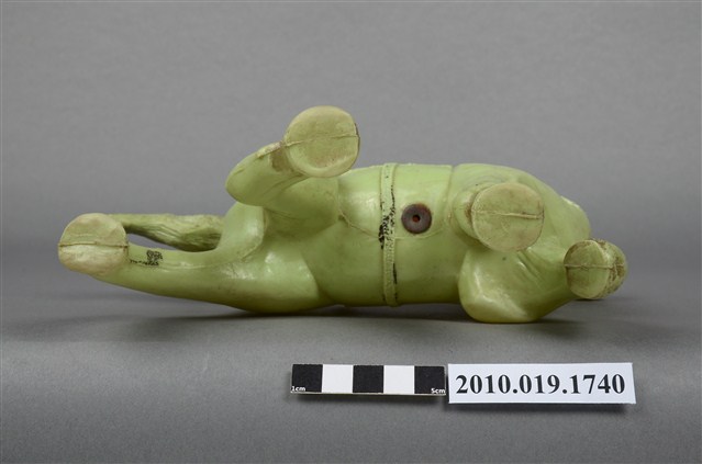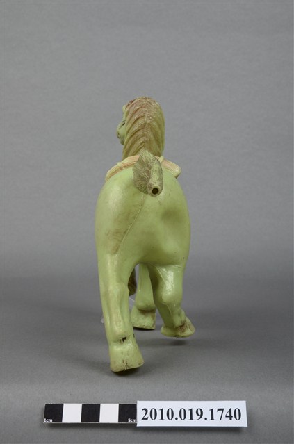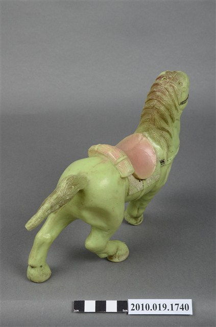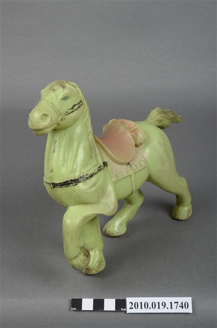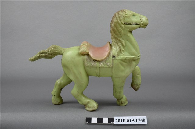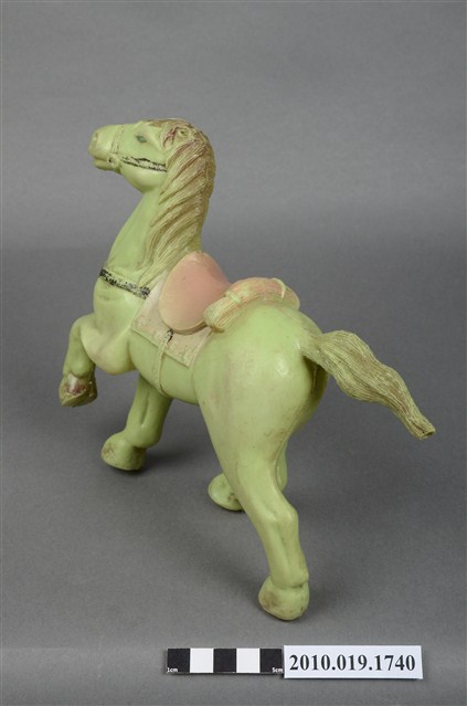 本物件為塑膠製馬造型擺飾,造形為馬,綠色眼睛,紅色鬃毛,馬的左前腿微微抬高,其餘著地,紅色馬鞍下方有滾花邊,黑色調教韁繩,尾巴飛揚,整匹馬有些許斑駁褪色。