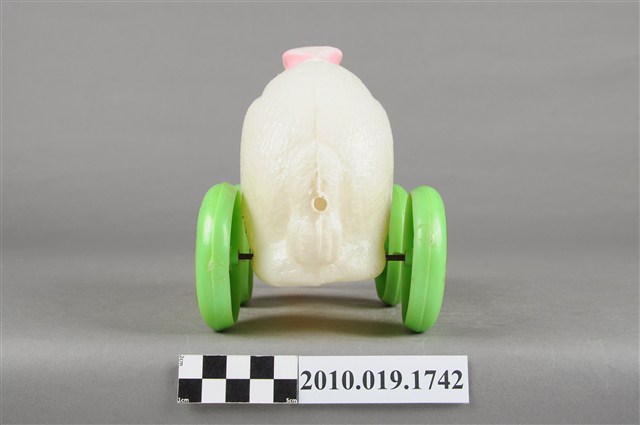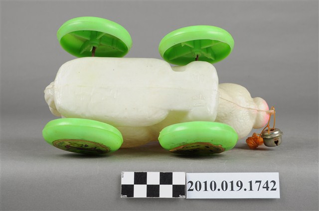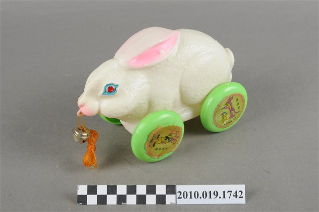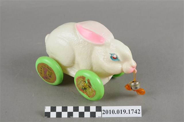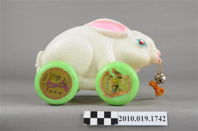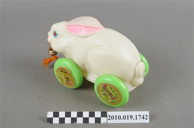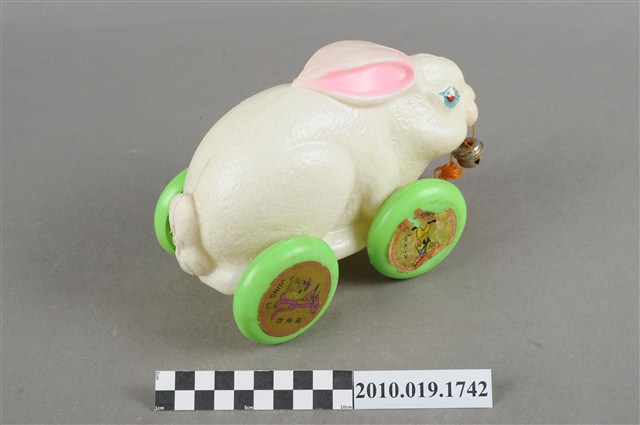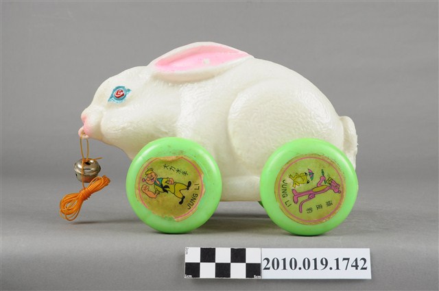 本物件為塑膠製兔造型玩具,藍色眼眶紅色眼睛,粉紅色耳朵,嘴巴前面由橘色塑膠繩串起一顆銀色鈴鐺,下方為4顆綠色輪子,前面2顆貼上大力水手圖案,後面2顆貼上頑皮豹圖案,都有英文字「JUNG LI」字樣,最底座寫著「榮利」。