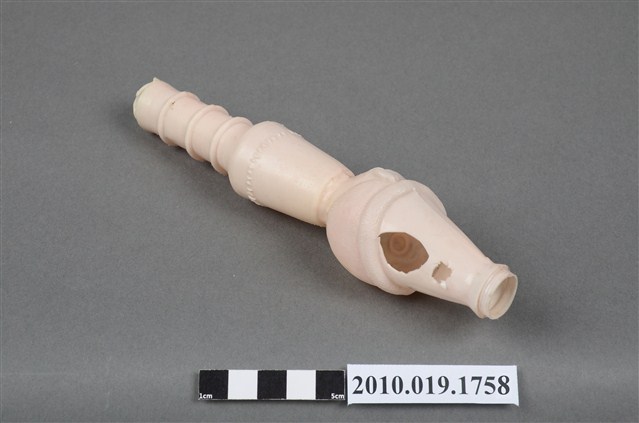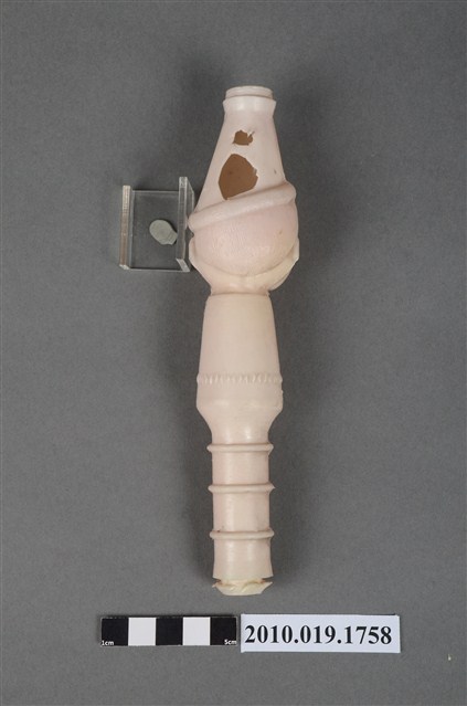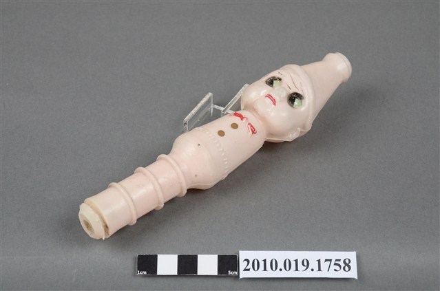 本物件為塑膠製笛子造型玩具,白色笛子,正面設計成玩偶的樣式,有眼睛、鼻子跟嘴巴,還有紅色領結,上面缺了吹嘴,原本設計成玩偶戴帽子的樣式,笛子正反面各有圓形指孔,最下面出音的地方有缺漏,笛子背面的上方也有破洞。