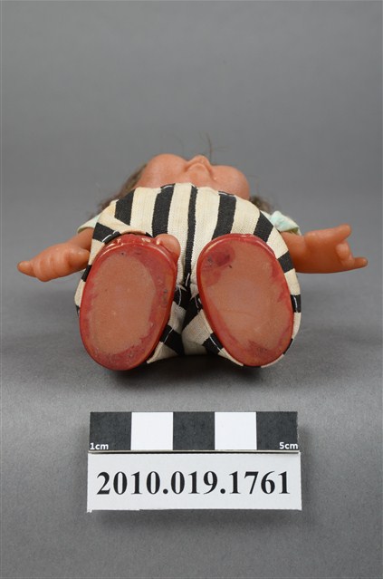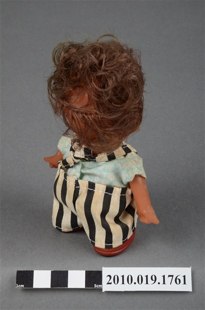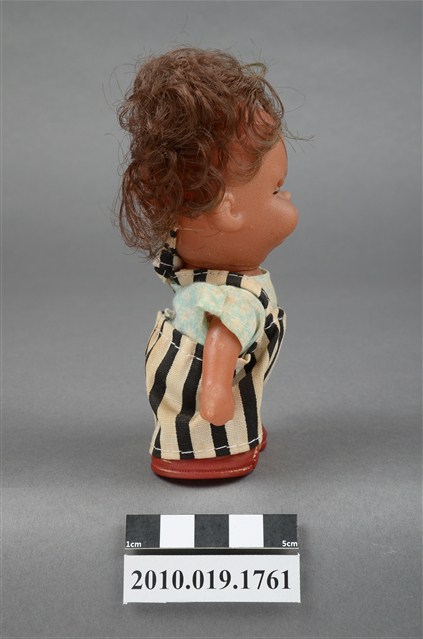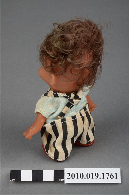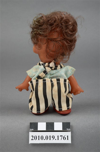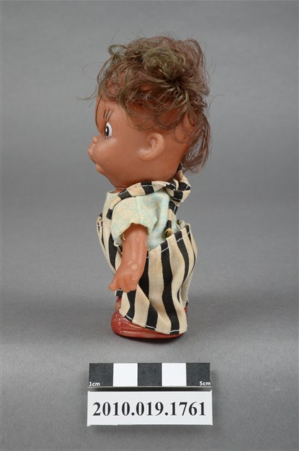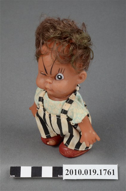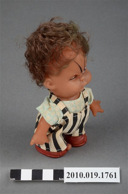本物件為怒玩偶,材質為塑膠與布料,呈現站姿。怒玩偶有深棕色捲髮,臉部表情生氣,眉間皺起兩道眉毛豎立,一眼睜圓,嘴巴微嘟,身穿短袖淡藍色上衣及脖子綁帶黑白直紋吊帶褲,服裝布料皆已泛黃,腳穿一雙紅色鞋子,其中一隻鞋露出腳拇指。
