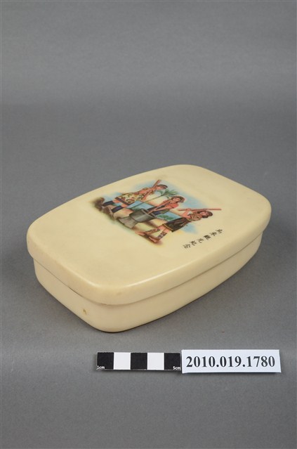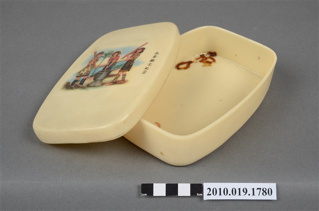 1.早年烏來地區發行的觀光紀念便當盒,上蓋與下盒直接扣合的結構。蓋頂繪有三位面帶微笑的泰雅族少女,身著傳統服飾,手上拿著木杵,圍著一個木臼正在進行舂搗,少女身後是一株檳榔樹與河流,旁邊寫著「烏來觀光紀念」字樣;整個畫面展現了泰雅族人的勤奮友善、傳統習俗的特色、部落的自然風貌。將這樣的圖像呈現在便當盒上,是相當具有紀念與實用價值的結合。2.因該盒已有一些年代,故已明顯泛黃,盒蓋上的圖案也有些微褪色,盒身內底部有明顯汙損,盒底則有多處磨損的狀況。