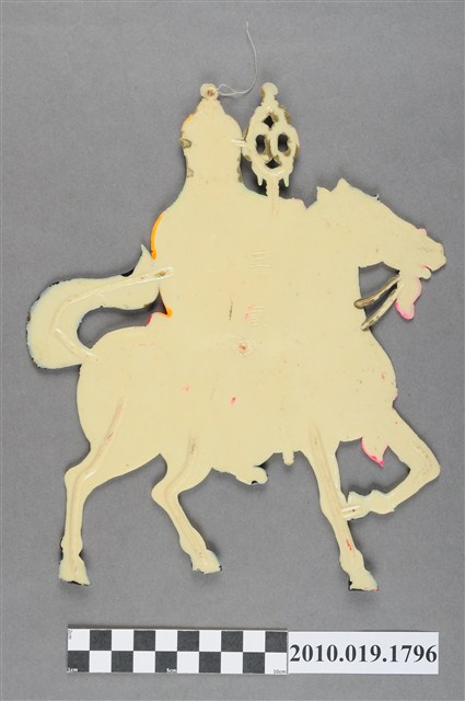1.本物件為唐三藏尪仔仙。扁平,單面浮雕圖案。正面圖案為騎在馬背上、一手握法杖和一手拉韁繩的唐三藏,其穿著袈裟。表面顏色為手繪,可見不規則筆觸,唐三藏皮膚部位和馬匹身體未著色,唐三藏衣著、馬匹鬃毛、尾巴、馬蹄和裝飾品等部位有著色。其背面有三藏之陰刻字樣。尪仔仙有小吊環。唐三藏為西遊記之角色。
