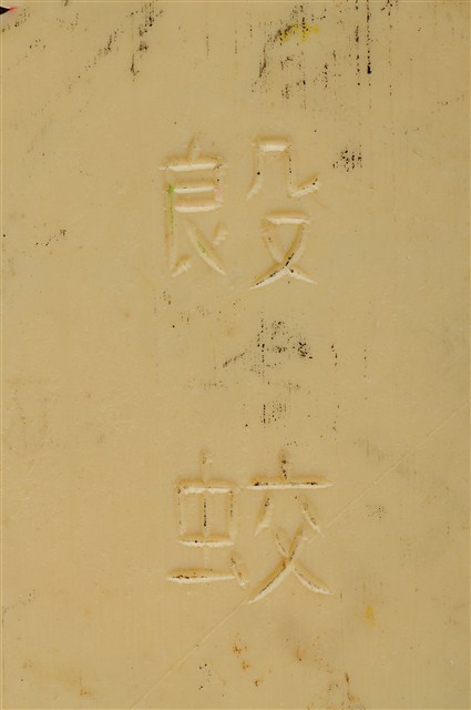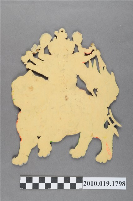 1.本物件為殷蛟尪仔仙。扁平,單面浮雕圖案。正面圖案為三頭六臂的殷蛟騎在麒麟上,其穿著戰袍,有5隻手拿著武器或神器。表面顏色為手繪,可見顏色暈染,塗有綠、黃、橘、金和銀等色,殷蛟皮膚部位未著色。其背面有殷蛟之陰刻字樣。尪仔仙有小吊環。殷蛟為封神演義之角色。