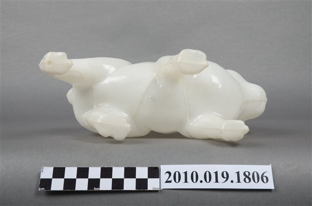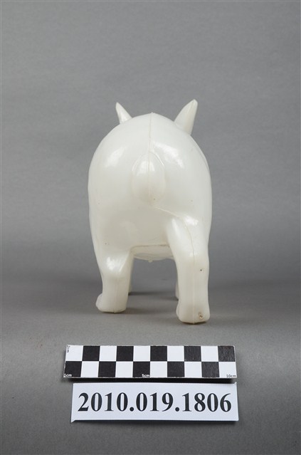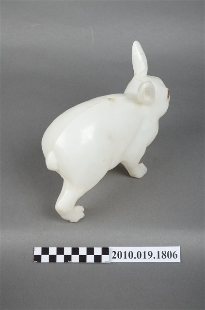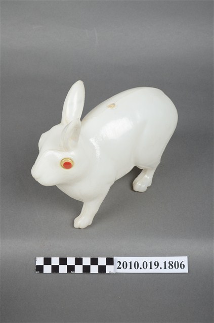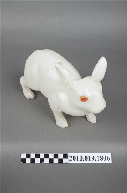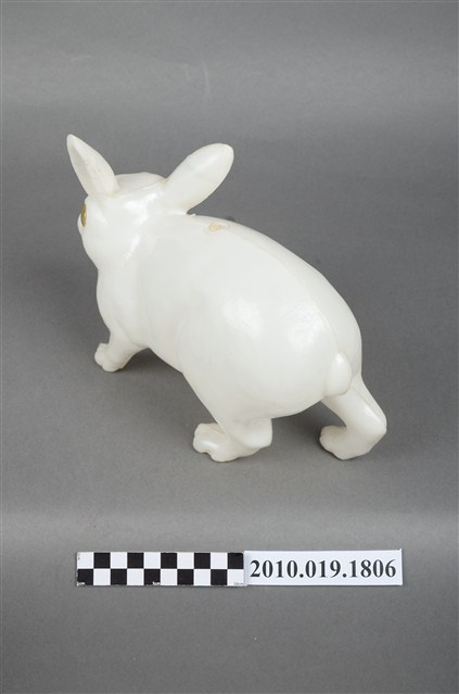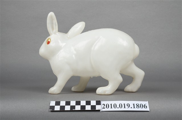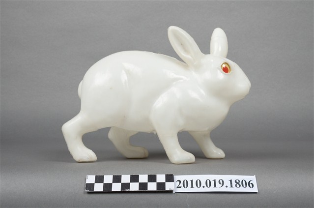 本物件為兔子燈籠,材質為塑膠,呈現四肢著地站立造型。兔子是隻白兔,有雙紅色的圓眼睛,由正面看耳朵一前一後豎立著,兔子側面觀察雖四肢著地站立,可前肢稍微前傾彷彿準備跳躍的樣子,背後臀部位置有個短短的尾巴。