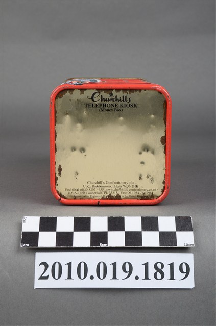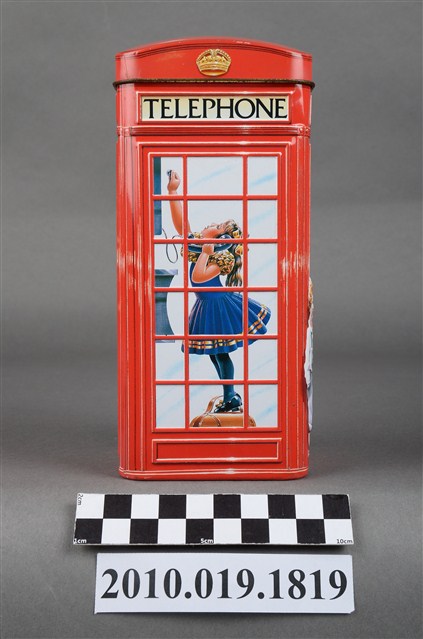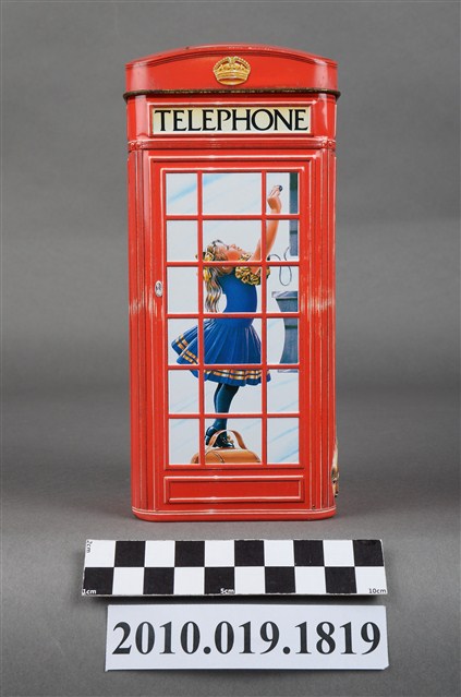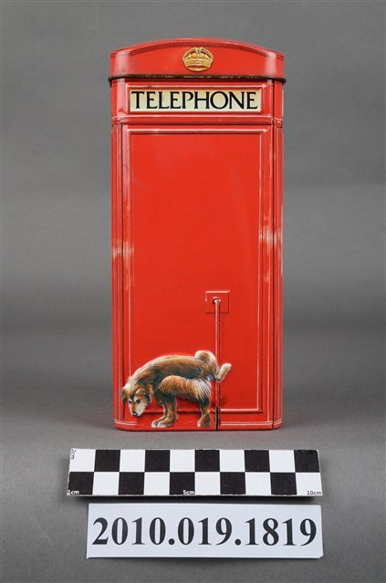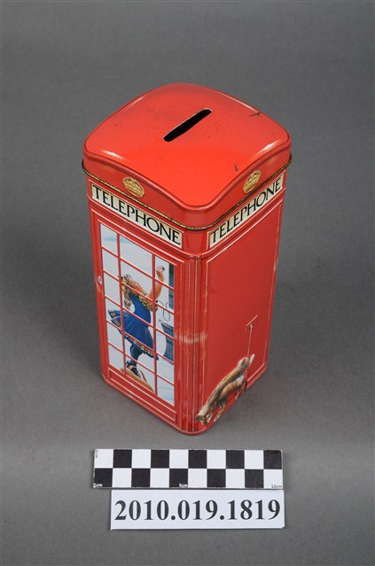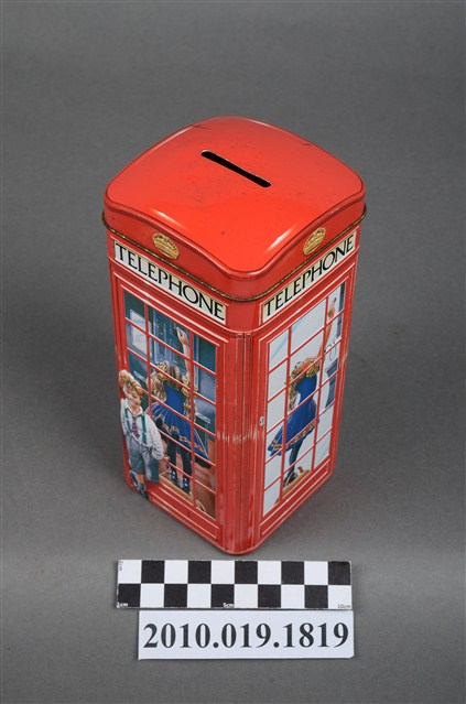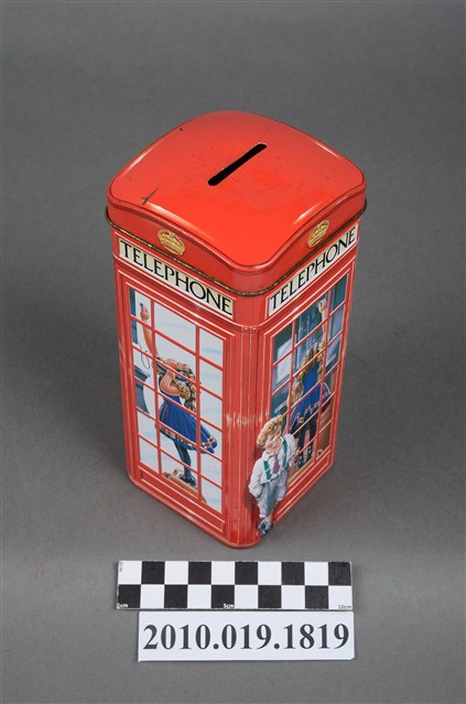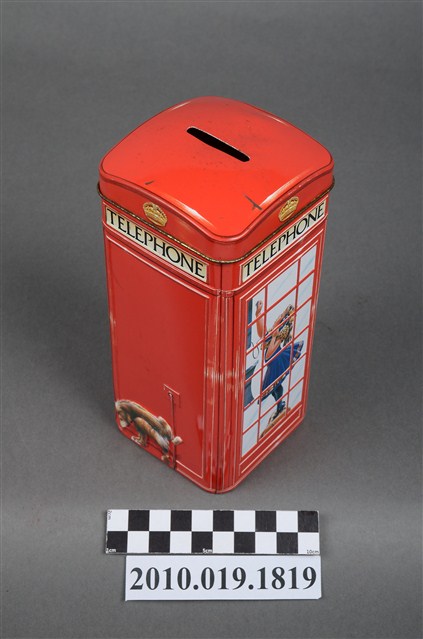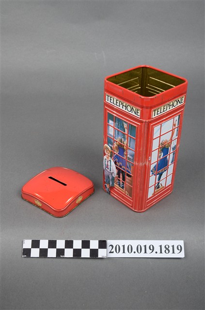 1.本物件為英國紅色電話亭存錢筒,材質為金屬。以柱狀立體的紅色電話亭為主體呈現,並以透視畫法描繪一個身穿藍色洋裝的小女孩,踩在手提包上投幣打電話,背對著她的門前有個小男孩雙手插口袋倚靠著,而電話亭有著金色皇冠的圓弧頂蓋其實也是存錢筒的上蓋,正中心有一長方形孔洞可投零錢。底部印有存錢筒相關事項及廠商logo:「Churchill's」、「TELEPHONE HIOSK」、「(Money Box)」、「Churchill's Confectionery plc」、「U.K.: Borehamwood,Herts WD6 2HP.」。背面有小狗圖案。