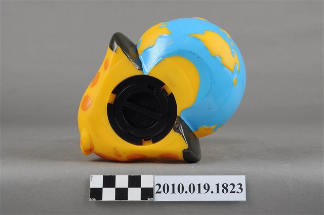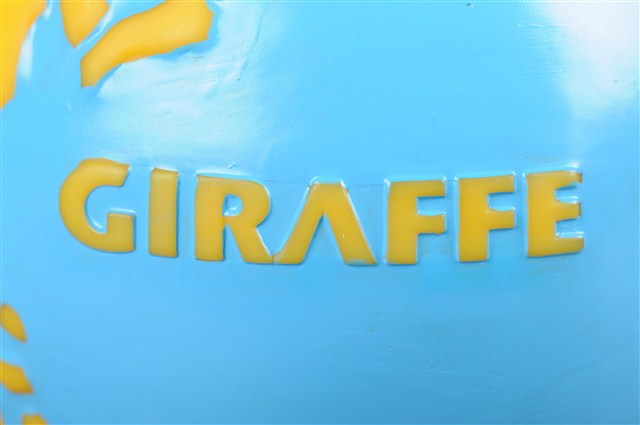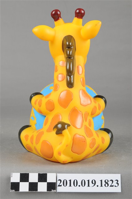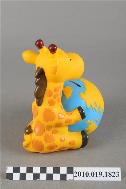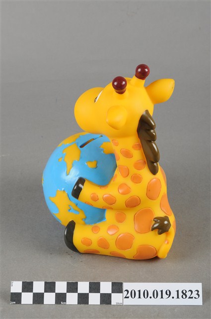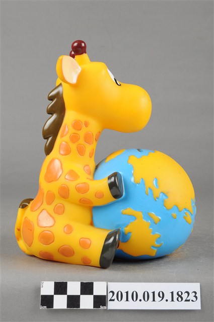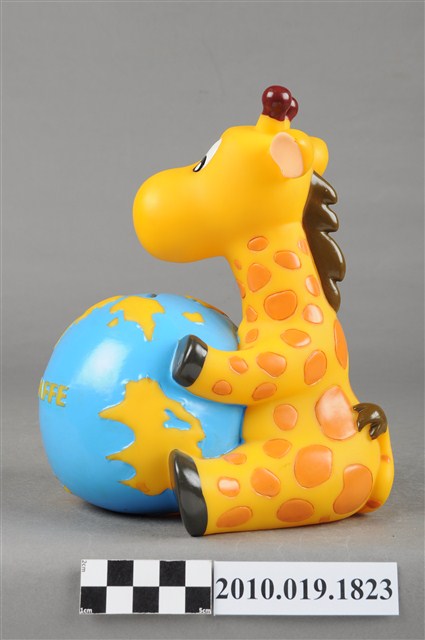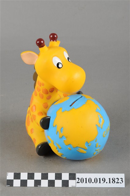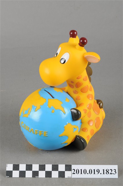 1.本物件為長頸鹿美語造型存錢筒,玩偶手抱地球,正面有「長頸鹿美語」的商標。