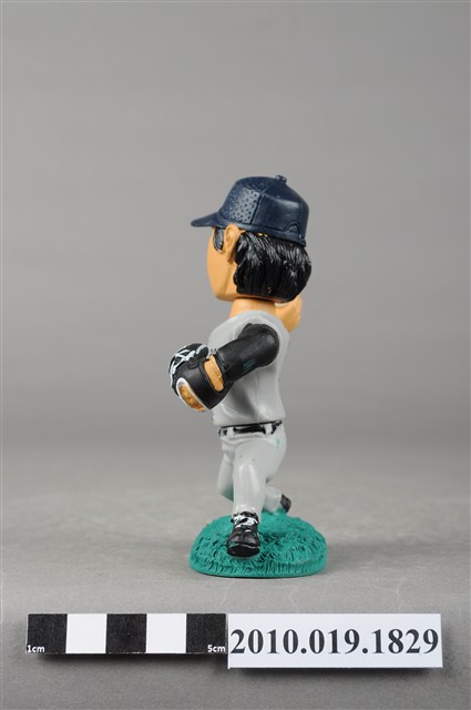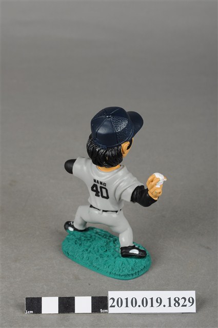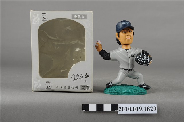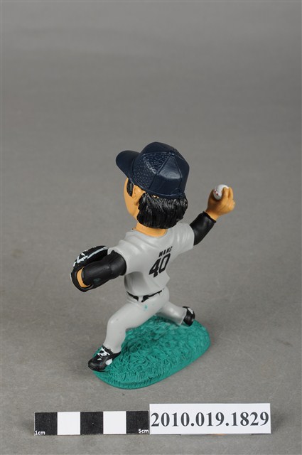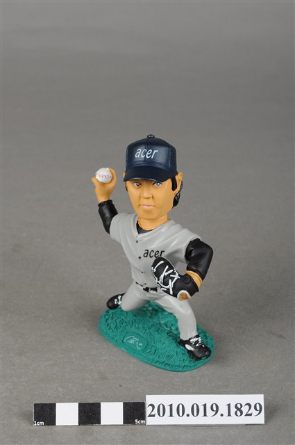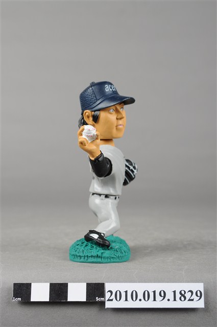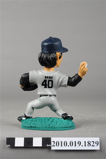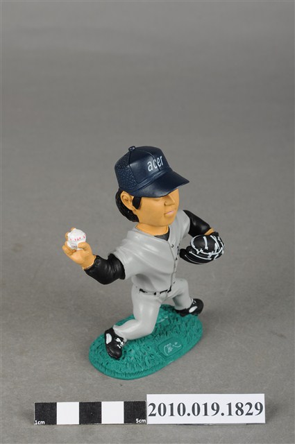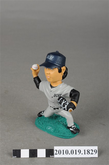 1.本物件為王建民公仔,材質為塑膠,整體呈現為王建民投球姿勢的造型。王建民戴著印有「acer」字樣的深藍色棒球帽,身穿灰色內搭黑色棒球服,衣服正面印有「acer」字樣,背面印有「WANG 40」字樣,手持棒球,另一手戴棒球手套,腳踩的綠色底座上印有王建民親筆簽名。