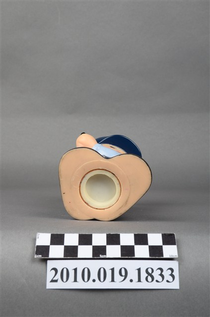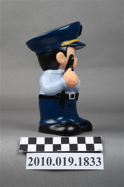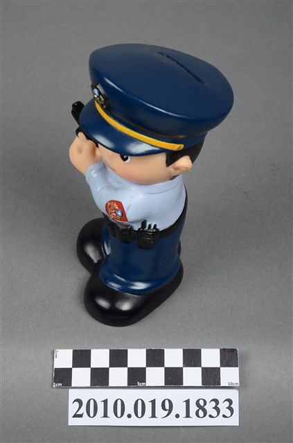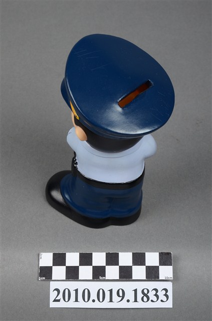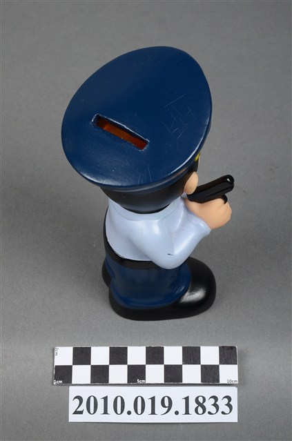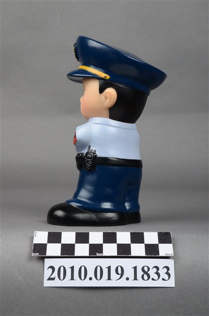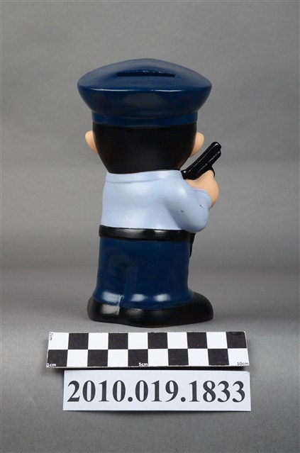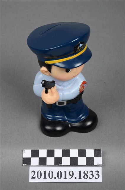 1.本物件為警察公仔存錢筒,材質為塑膠,整體呈現為雙手持槍站立造型。Q版警察面帶微笑,頭戴深藍警帽,頂部有一長方形孔洞可投零錢,身穿警察制服,肩部有警察臂章,腰部有無線電及腰包等配件,底部中心有一白色圓形塞子,應為取出零錢處。