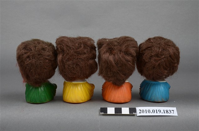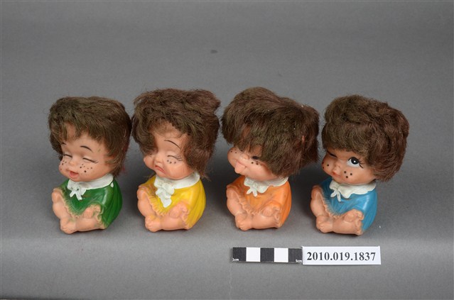 本物件為喜怒哀樂表情玩偶,高約8公分,寬約5公分,材質為軟膠,共有四個表情各異的玩偶,姿勢皆為盤坐,雙手置於膝上,穿著領口有蝴蝶結的小洋裝,頭髮茂密,底部有「TAIWAN」字樣。