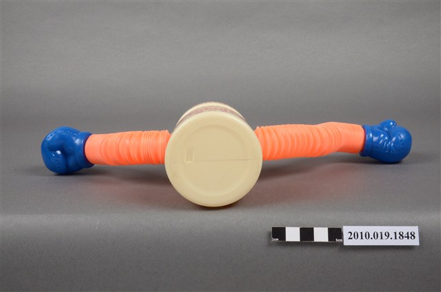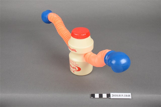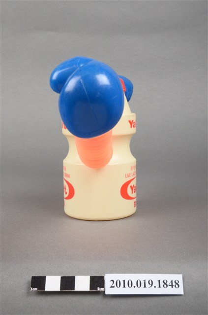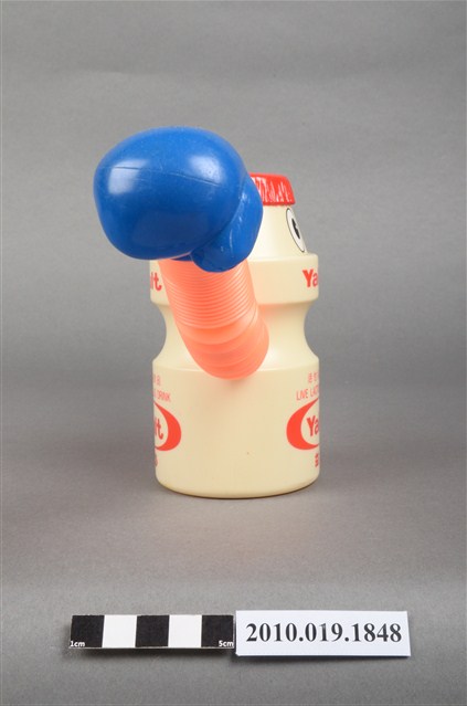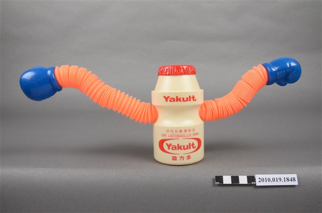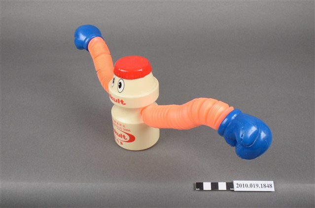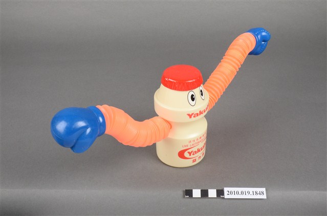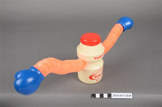 1.本物件為益力多公仔,材質為塑膠,呈現為戴著拳擊手套的益力多造型。益力多公仔有對眼睛,戴著應該是瓶蓋的紅色帽子,在瓶身凹處有一雙會伸縮又戴著藍色拳擊手套的手,益力多正面及背面都印有「Yakult」、「活性乳酸菌飲品」、「LIVE LACTOBACILLUS DRINK」、「益力多」字樣及logo。