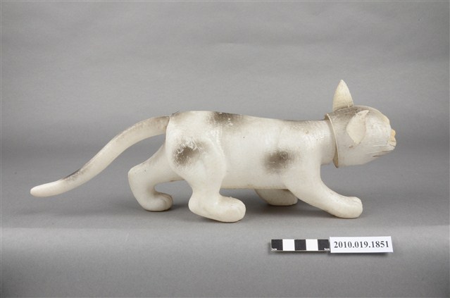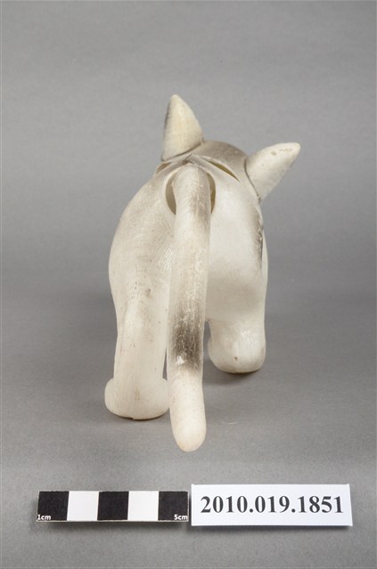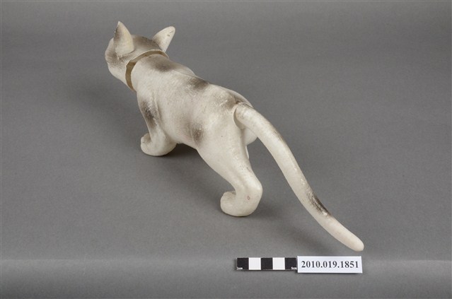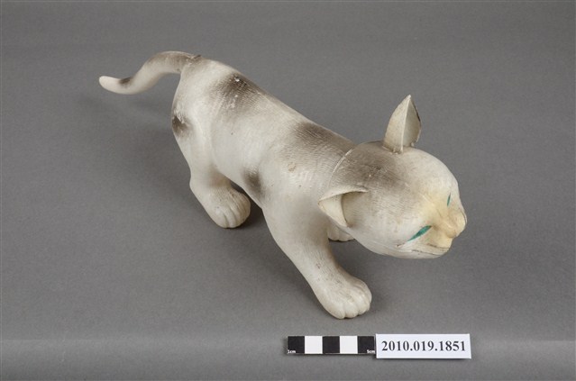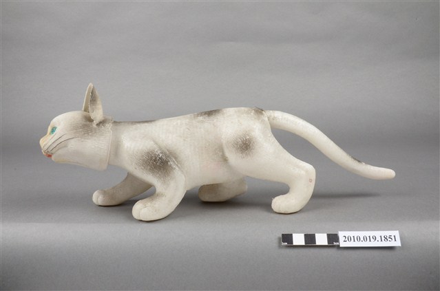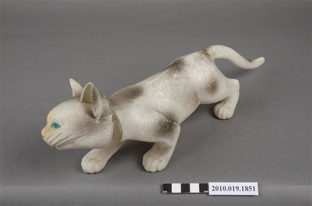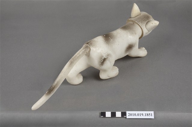 本物件為搖頭貓玩偶,材質為塑膠,整體呈現為貓行進的模樣。搖頭貓玩偶是隻有少許黑色斑點的白貓,有一對綠色眼睛、伏貼的鬍鬚、豎立的尖耳朵,搖頭貓玩偶製作時從頭到尾都有將細毛表現出來,且以同手同腳姿勢行進,另外,貓頭及貓尾都設有活動關節與身體連接,所以放置時會晃動。