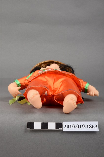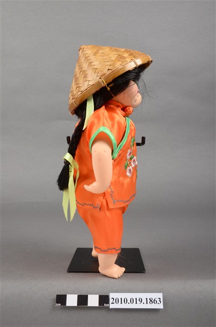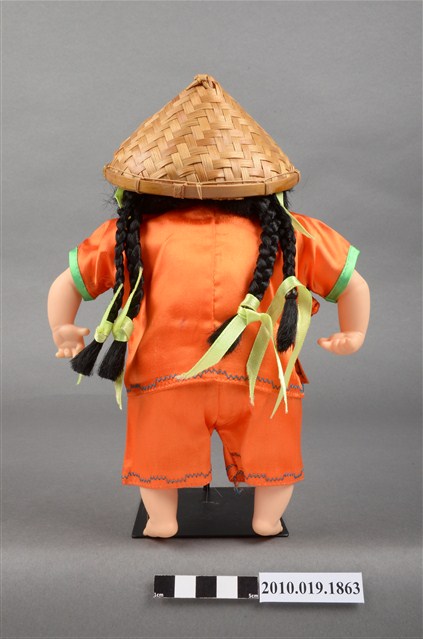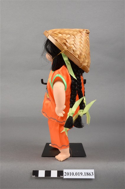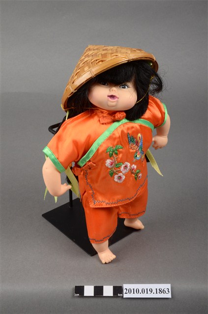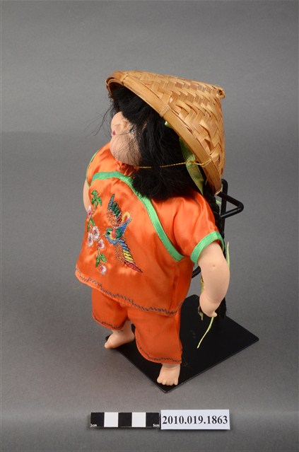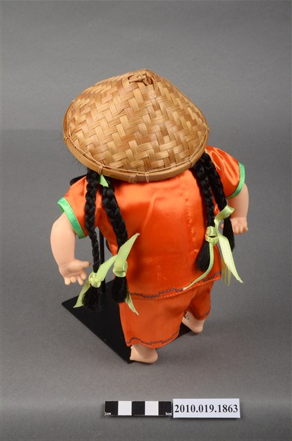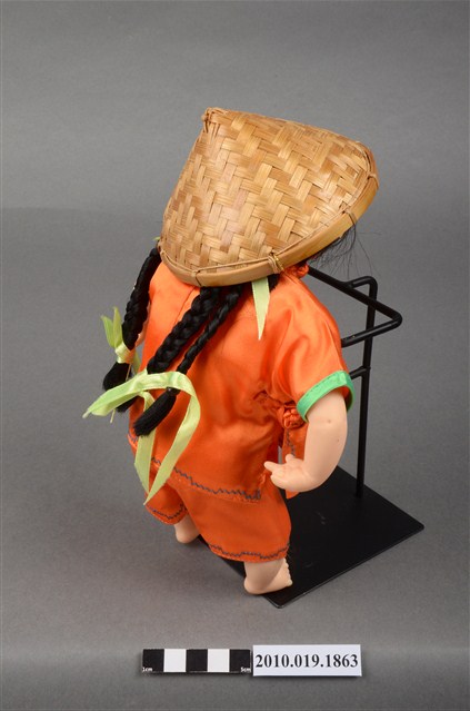 本物件為戴斗笠採茶姑娘玩偶,材質為塑膠、竹與布料,呈現站姿。姑娘有一頭蓬鬆黑髮,並綁著四條繫有綠色緞帶的髮辮放在背後,頭上戴著一頂斗笠,有雙炯炯有神的眼睛、圓嘟嘟的臉頰、小巧的鼻子與微張的嘴巴,穿著一身亮橘色採茶服裝,衣服正面有花鳥刺繡圖案,光著雙腳。