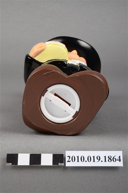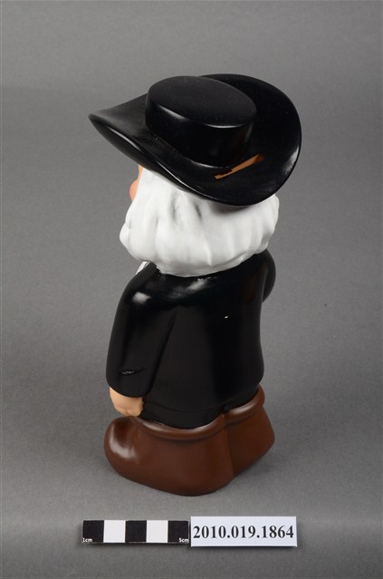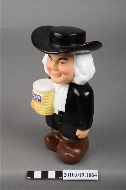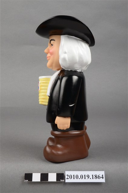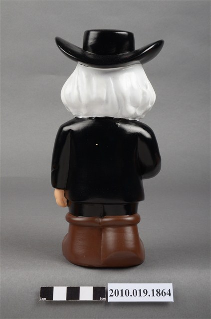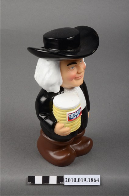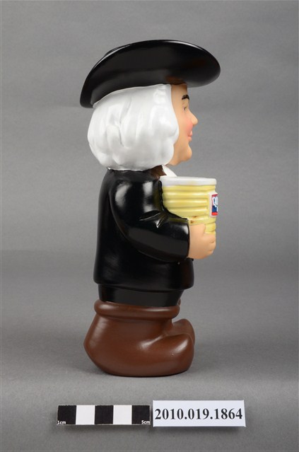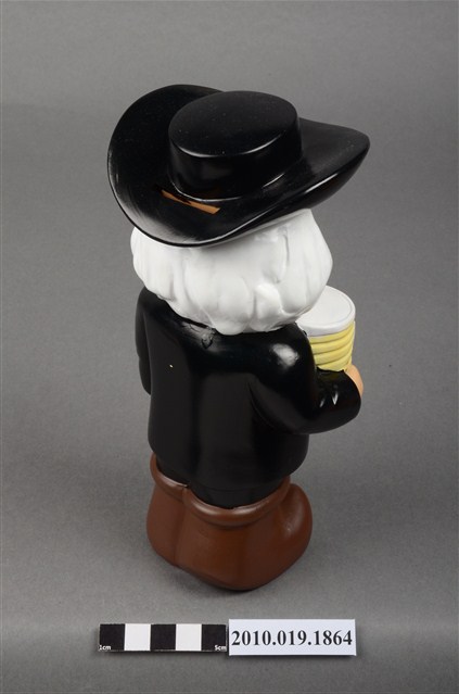 1.本物件為桂格先生存錢筒。造型為白髮長者,穿著黑色服飾,手捧著有桂格商標的鐵罐。