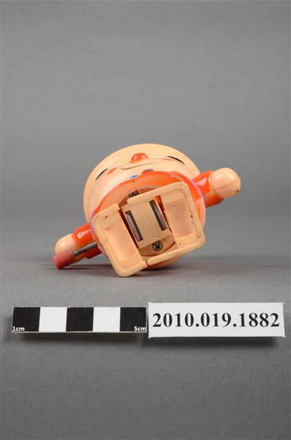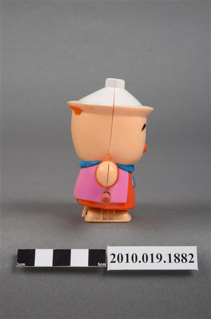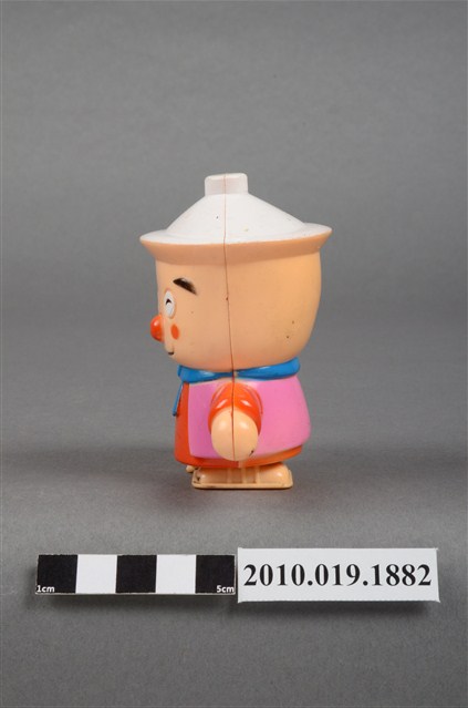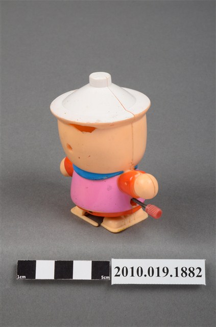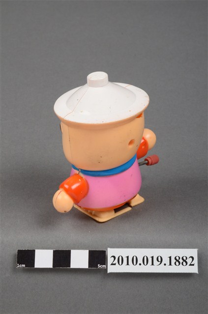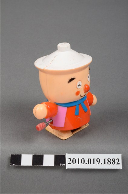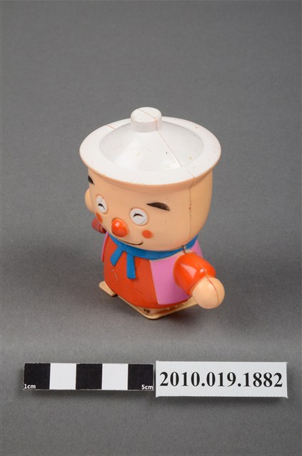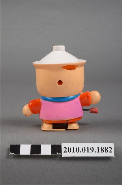 本物件為卡通造型發條玩偶,材質為塑膠,呈現站姿。發條玩偶的頭部像個陶鍋,頭頂有個白色蓋子,臉部有雙笑彎的雙眼、圓圓的橘色鼻子、圓圓的橘色腮紅、微笑的嘴巴,脖子圍著藍色圍巾,身穿橘色衣服外搭粉紅色背心,身體側邊有個紅色發條旋鈕,可讓玩偶行進。