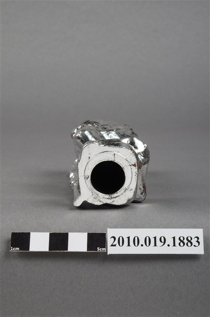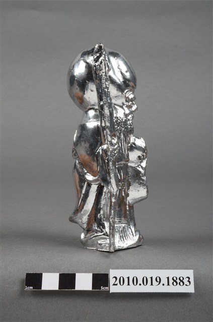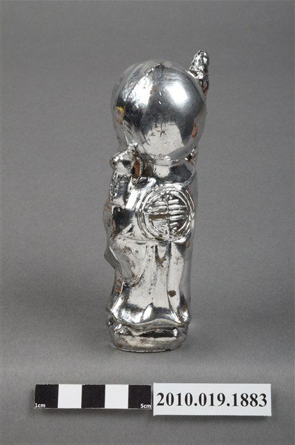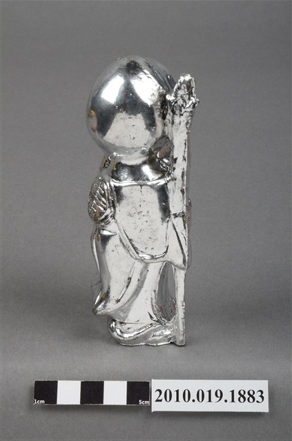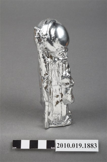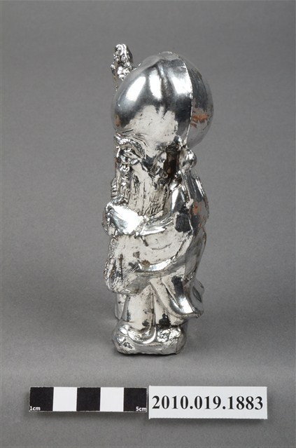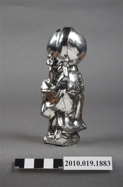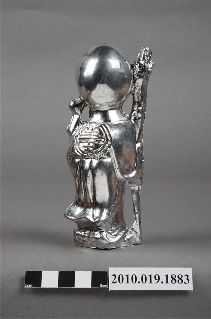 本物件為銀色南極仙翁存錢筒,材質為塑膠,呈現站姿。南極仙翁整尊為銀色,身穿的長袍背後有個圓形壽字,一手持拐杖,另一手捧著桃子,頭頂上方有一長方形孔洞可投零錢,底部中心有一圓形孔洞,應為取出零錢處。