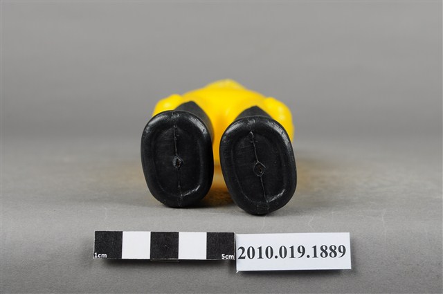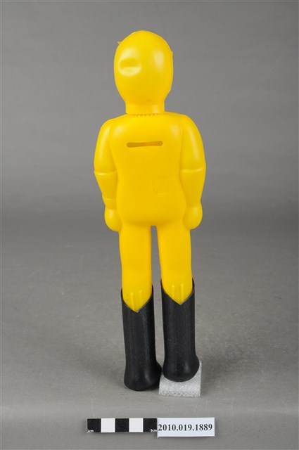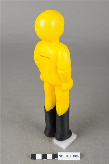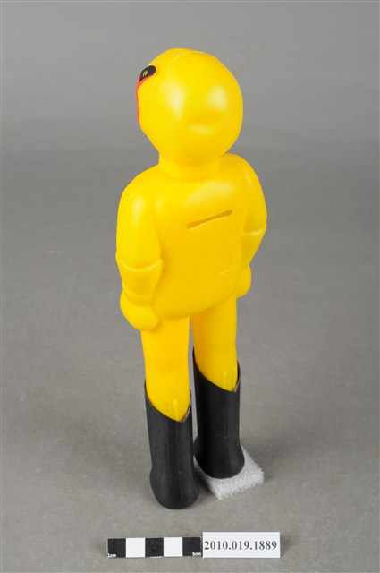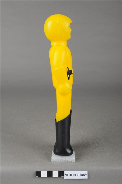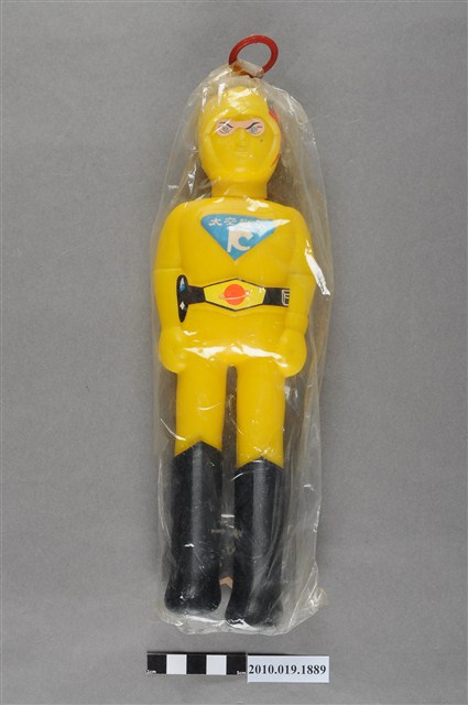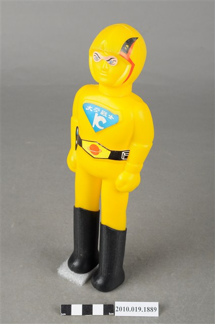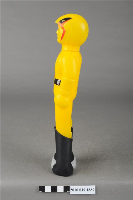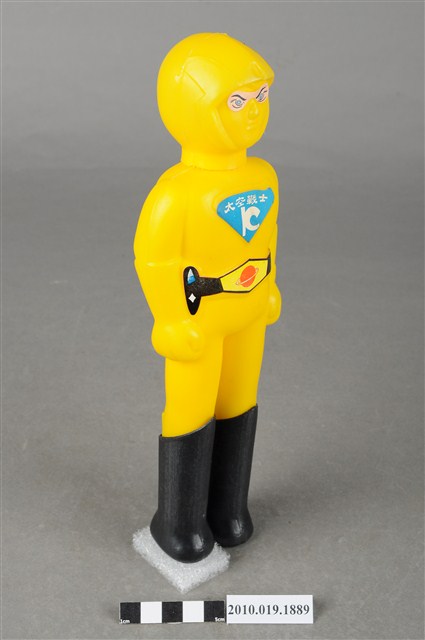 本物件為黃色太空戰士玩偶,材質為塑膠,呈現站姿。太空戰士戴著黃色蒙面頭套,露出一雙瞋目看著前方,身穿黃色連身衣,胸前有個寫著「太空戰士」的藍色倒三角型標誌,腰間繫著有太空星球圖案的黑色腰帶,後背一長方形孔洞,雙腳穿著黑色長靴。