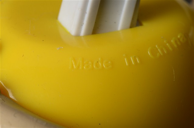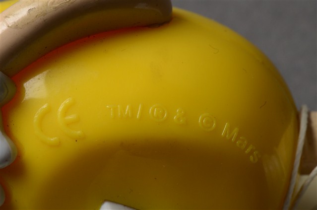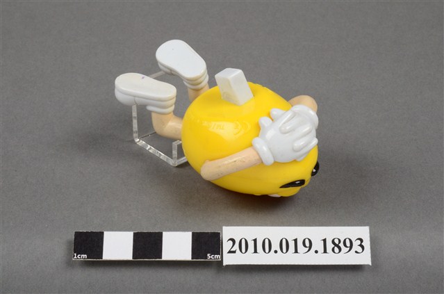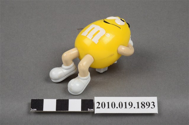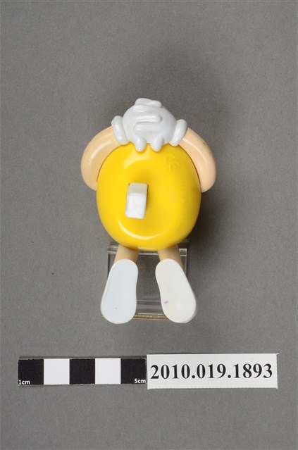 1.本物件為黃色M&M'S玩偶,材質為塑膠,本體為黃色,頭戴紫黃色樂隊帽,雙手交叉抱頭,腳穿白色鞋子,呈現躺下的姿勢。背面有「MARS」、「Made in China」字樣。